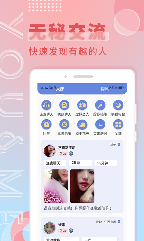 在游觅app上,你只需要展示出自己的兴趣与特长,就能轻松在附近找到心仪的小姐姐一起玩游戏、聊天,让你的闲暇时光充满乐趣。这里的用户都是兴趣相投的伙伴,只要彼此看对眼,就可以直接邀约,无需浪费过多的时间,只要你能积极主动一些就好!