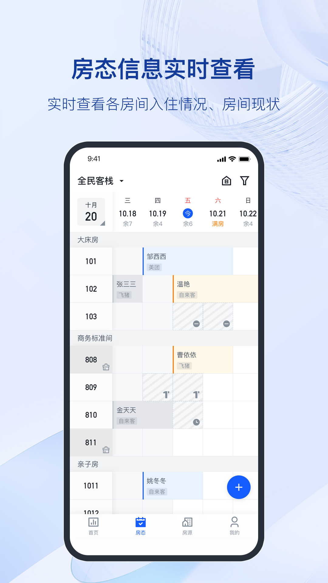 系统会自动同步门店下其他账号对房态信息的修改,还能通过颜色区分不同状态的订单,方便跟进。