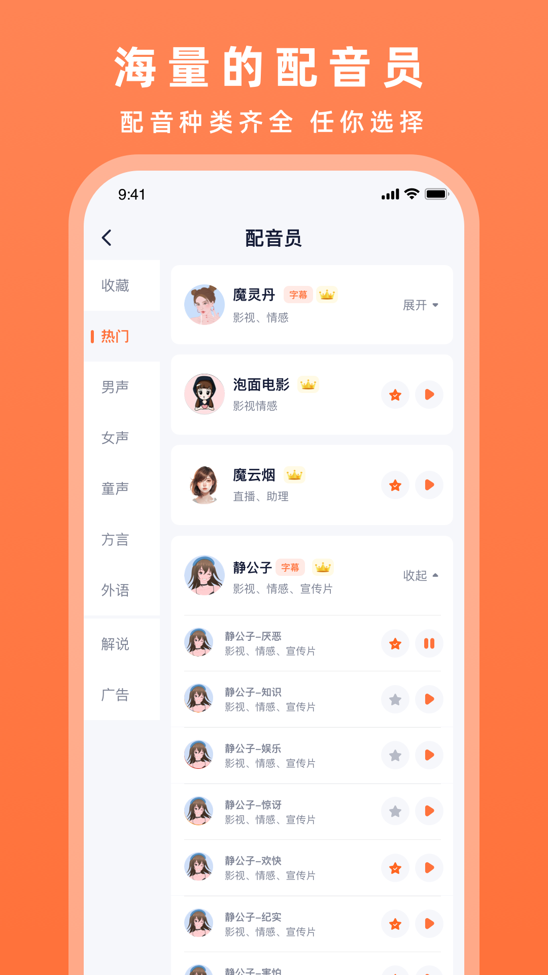 上百款优质声音,上千种不同风格,各种领域尽享品质配音!
