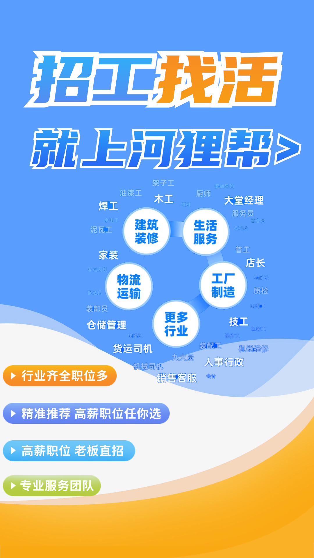 河狸帮是一个专业服务广大普通劳动者和中小企业的招工找活、灵活就业、灵活用工平台,覆盖建筑装修、工厂制造、物流运输、生活服务、机械司机、餐饮酒旅、人事行政、销售客服、新能源、农林牧等行业,旨在解决求职者和招聘者的信息壁垒,帮助求职者找到靠谱好工作,用人老板找到靠谱牛人。大数据技术,推荐招工找活精准匹配。