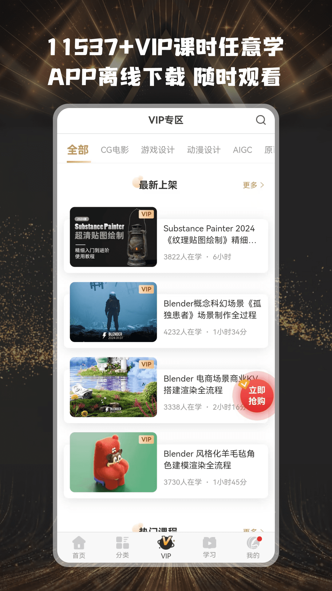 - **分类案例**:我们不但提供多种软件教程,还拥有平面设计、工业设计、影视游戏、AIGC、原画插画等行业的案例实操课程,更有AI绘画、角色设计、CG场景制作、特效制作、次世代角色等技能教学内容。免费课程、VIP课程、付费课程、特训营等多种课程形式,助您像升级打怪一样逐步提升,轻松掌握相关知识技能。