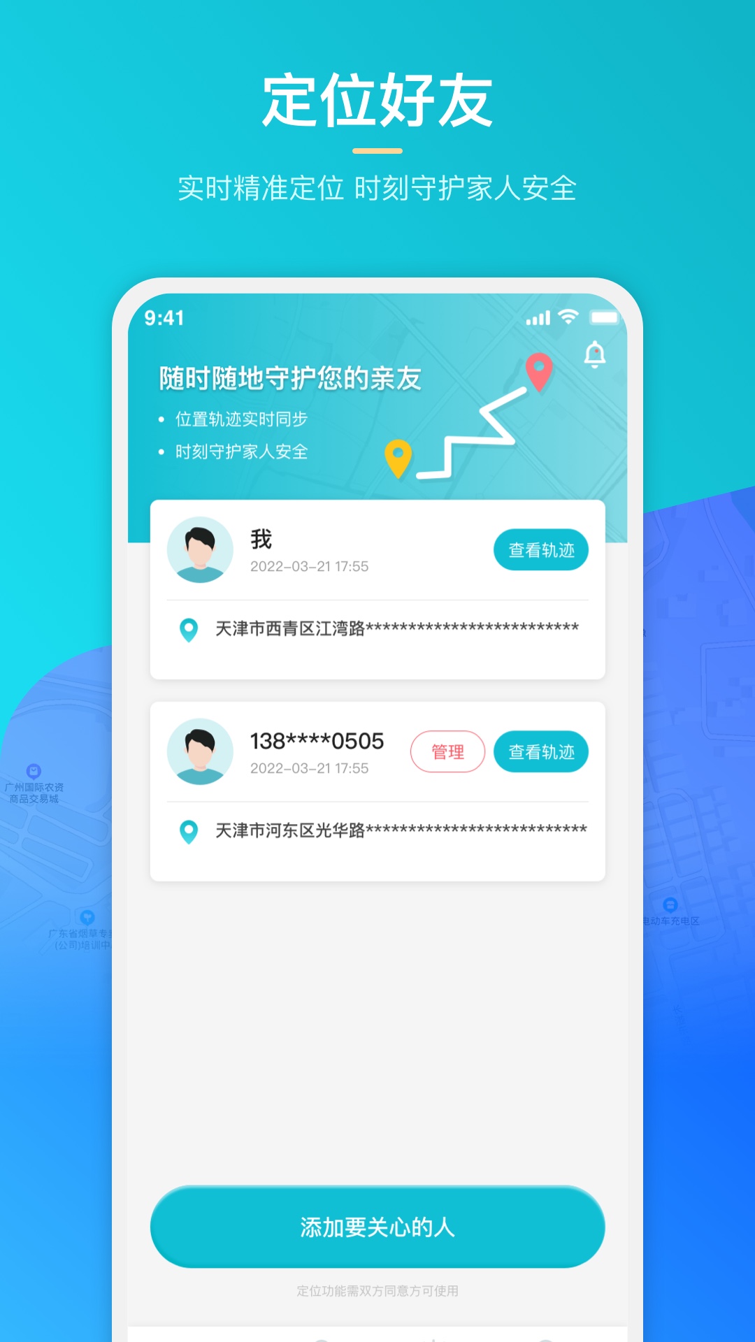 温馨提示:定位必须提前得到对方同意,若对方不同意则无法定位,并且严禁使用本软件进行非法恶意监控。