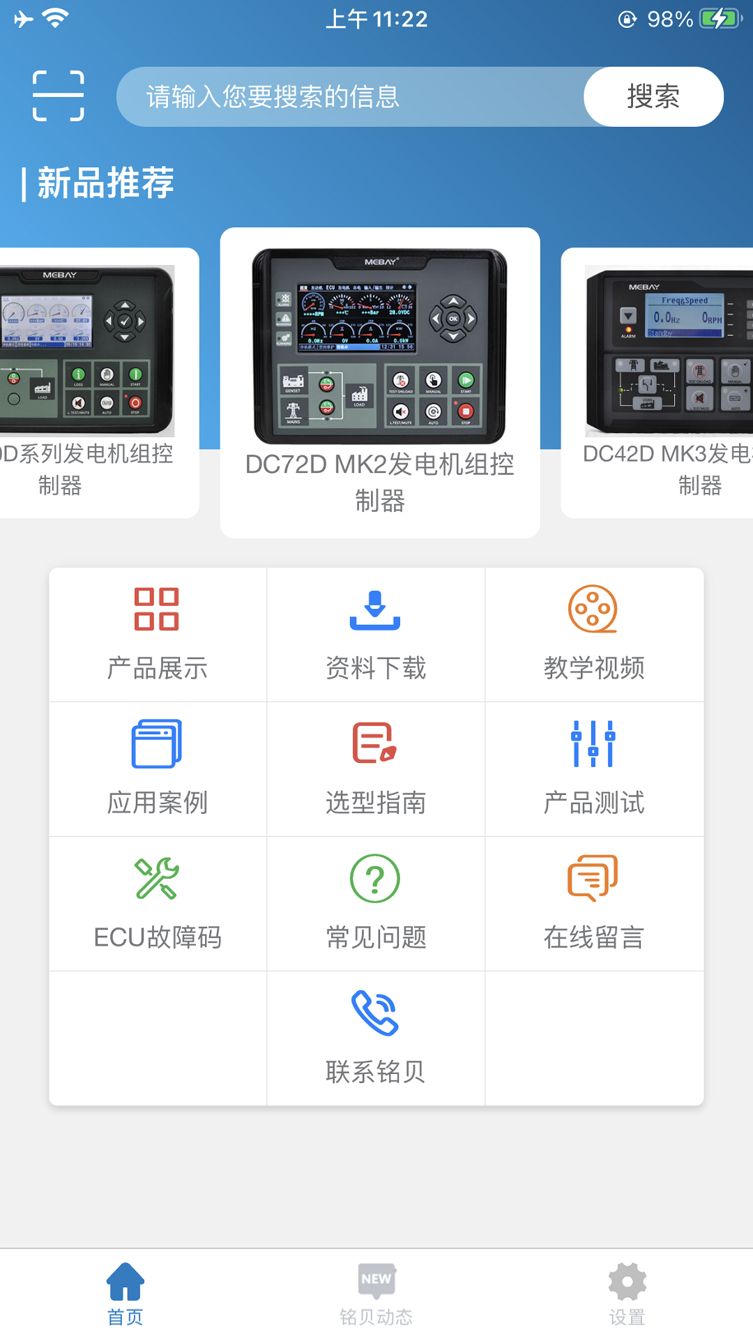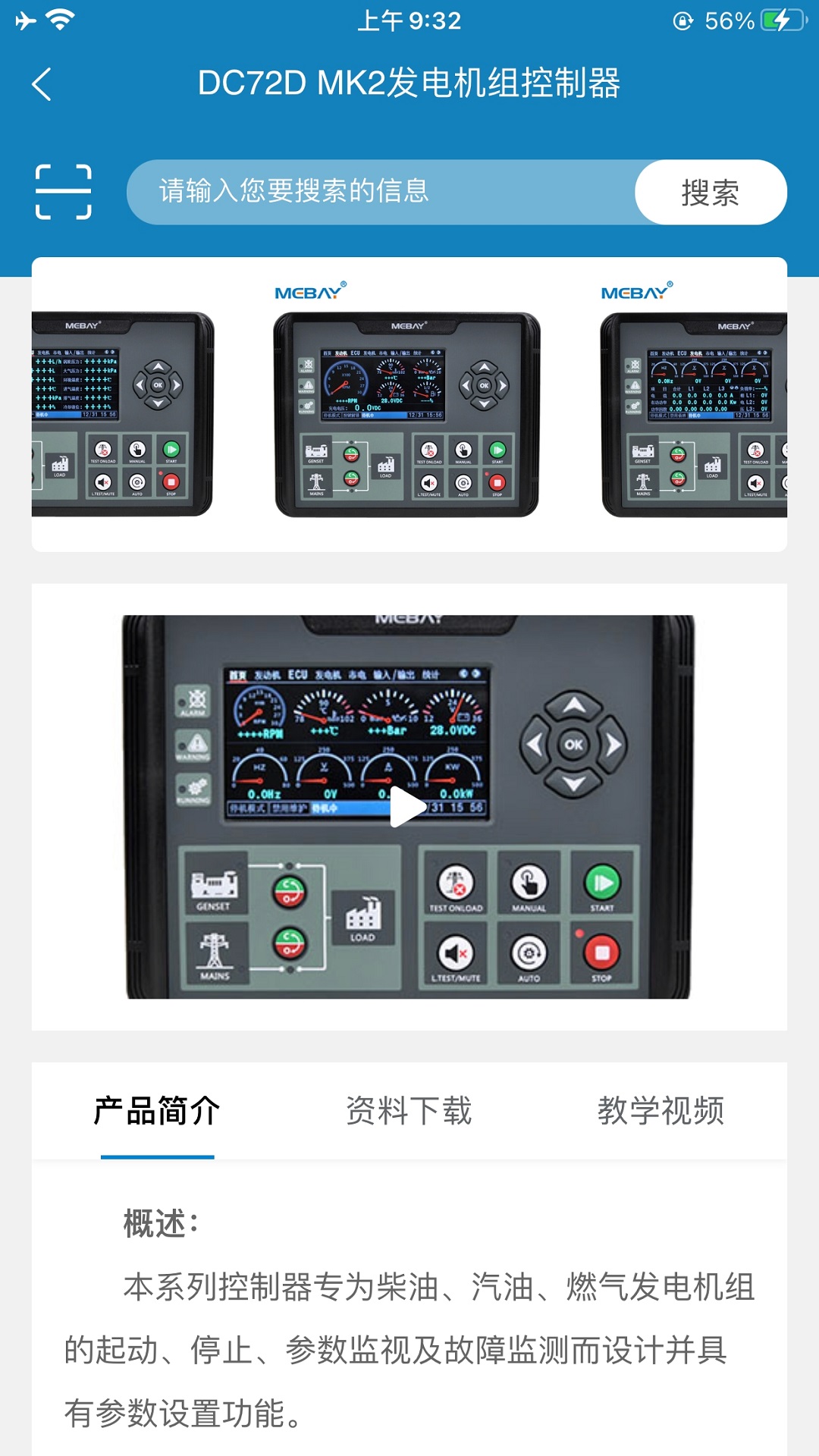 i MEBAY是一款由铭贝科技自主研发的为其生产的发电机控制器产品配套的服务软件,方便用户了解和使用铭贝产品,是与用户沟通的一座信息化桥梁。通过本应用软件,可方便的查询到铭贝科技生产的发电机控制器等产品的相关信息,获取相关资讯。 主要功能如下: 1、铭贝动态:可以及时的了解铭贝科技的实时动向; 2、产品展示:可查询铭贝科技生产的所有产品的功能简介; 3、资料下载:可以下载和在线查看所有铭贝产品的使用数据手册,方便产品使用; 4、教学视频:可以在线查看产品教学视频,方便用户正确的使用铭贝产品; 3、二维码扫描:本应用的二维码扫描功能,可以扫描铭贝控制器背面的产品二维码,追溯产品的生产信息,并可方便的查询到该产品的相关技术资料。 4、在线留言:通过本功能,可直接给铭贝反馈产品需求和建议。
