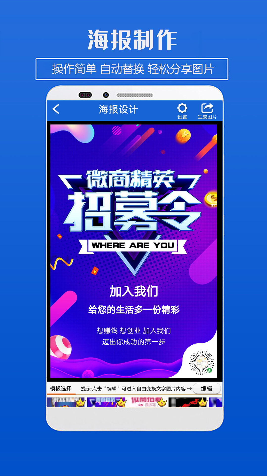 海报制作:一款为企业打造的海报制作利器,堪称企业营销素材的得力助手,在企业营销事务策划以及营销市场推广方面发挥重要作用,是助力企业达成全员营销的一站式营销服务工具。
