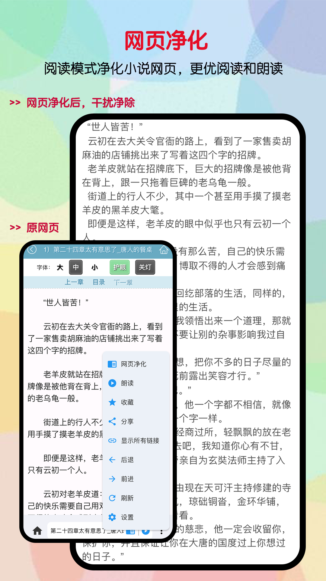 【网页净化】:网页阅读模式净化网页,适合小说网站页面阅读和朗读。