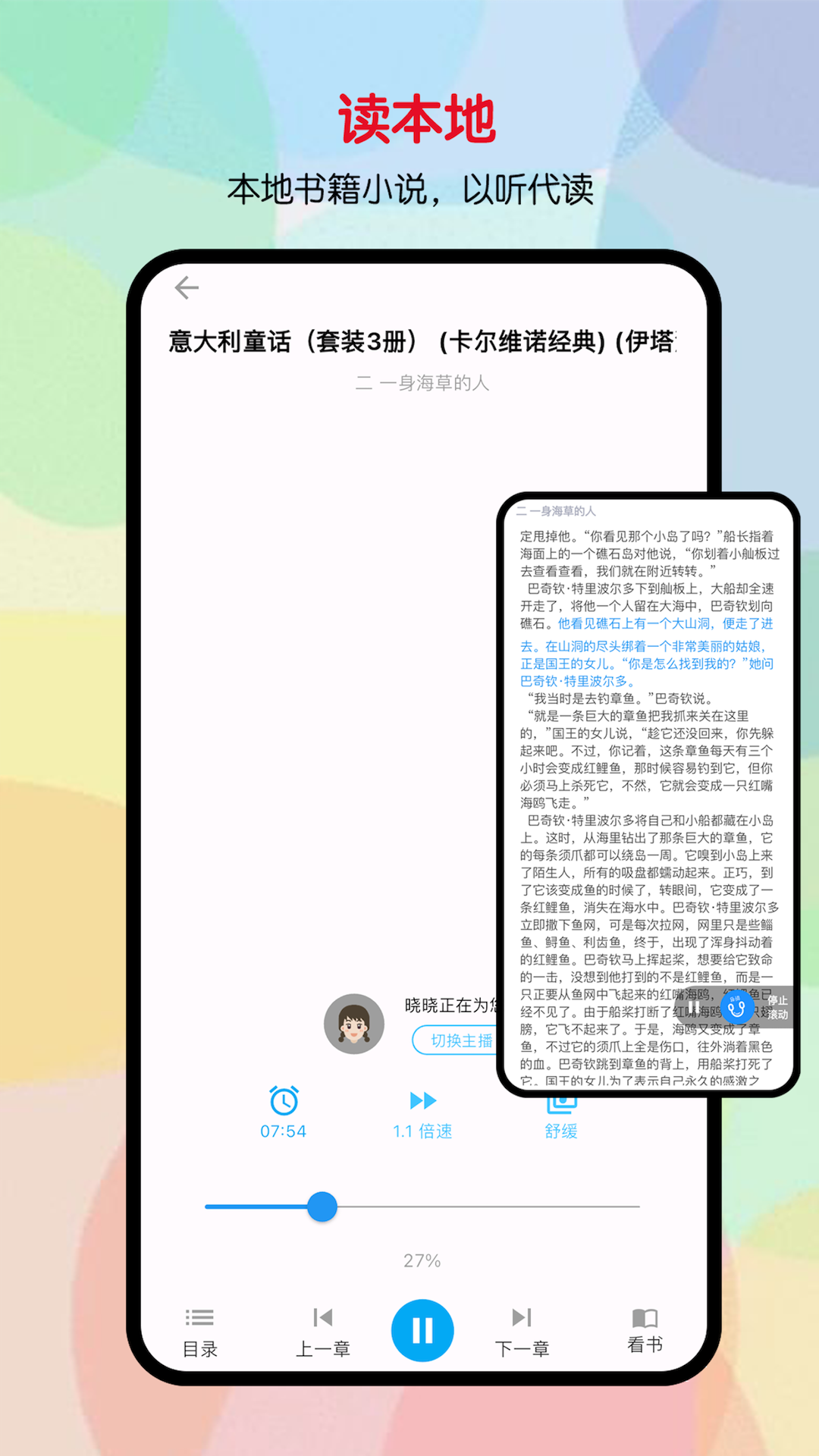 【智能听书】:多个预置AI主播声线供您选择,包含故事主播、新闻主播和童声主播,有男女音,也有萝莉音,让听书变成一种享受,不再是生硬的声音。