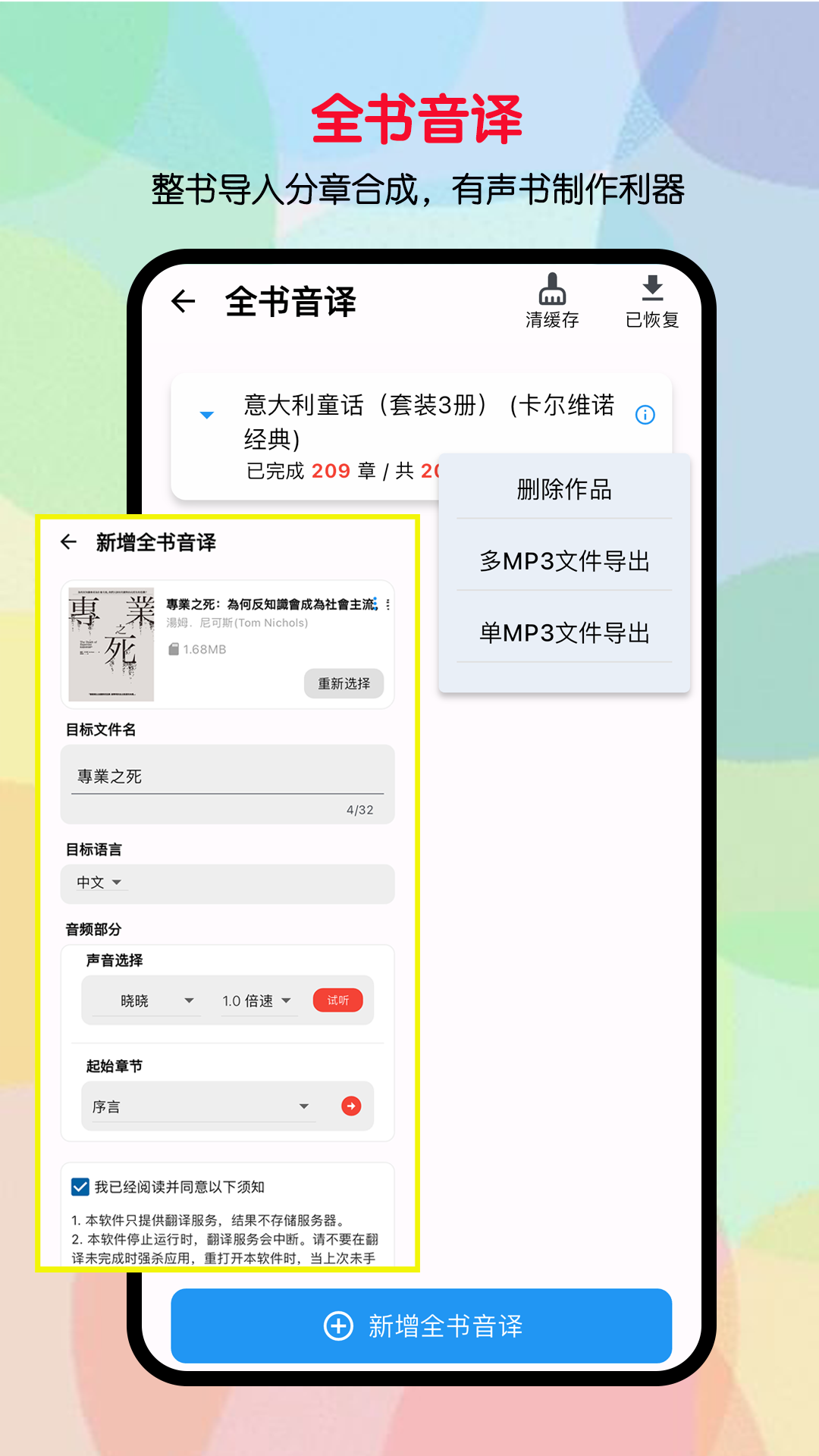 【全书音译】:导入一本本地书籍,帮你按章生成音频,生成完后可离线收听。