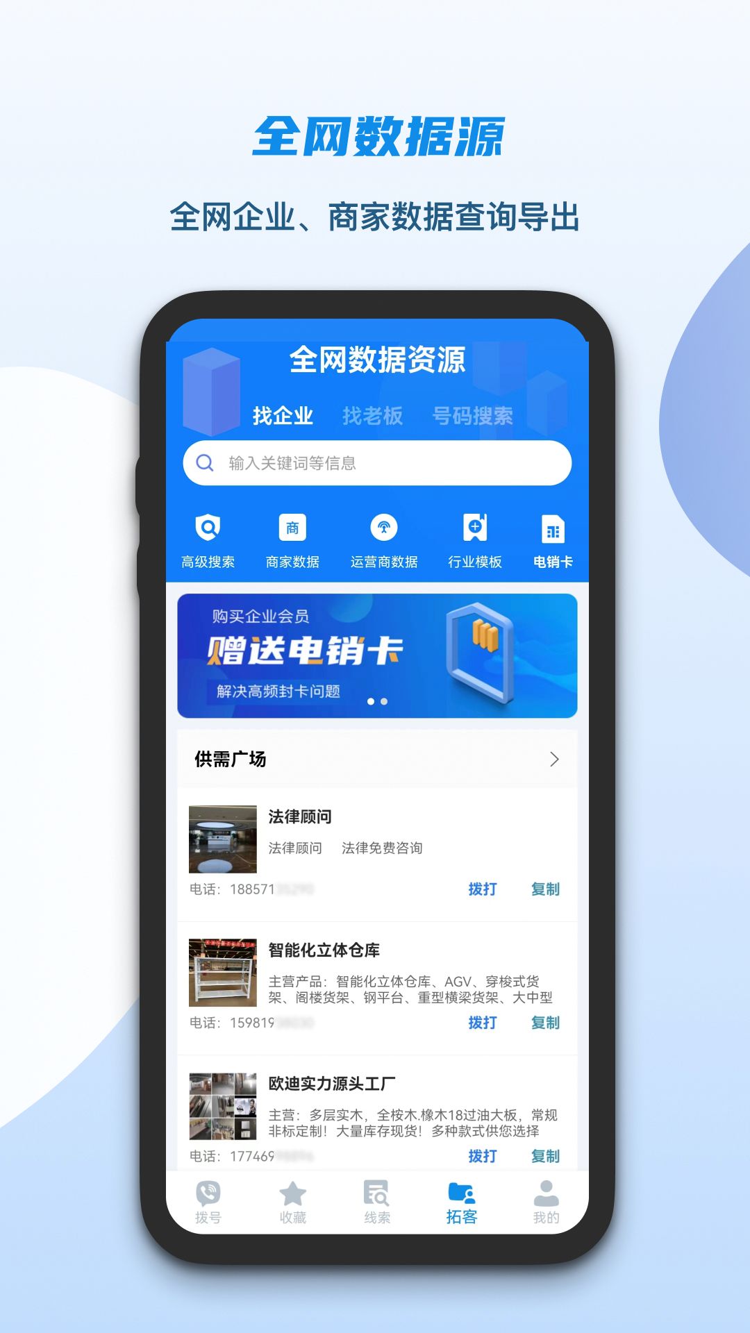 拓客方面支持全网企业数据查询导出、商家数据查询导出、运营商号码段查询导出、行业模板查询导出等功能。