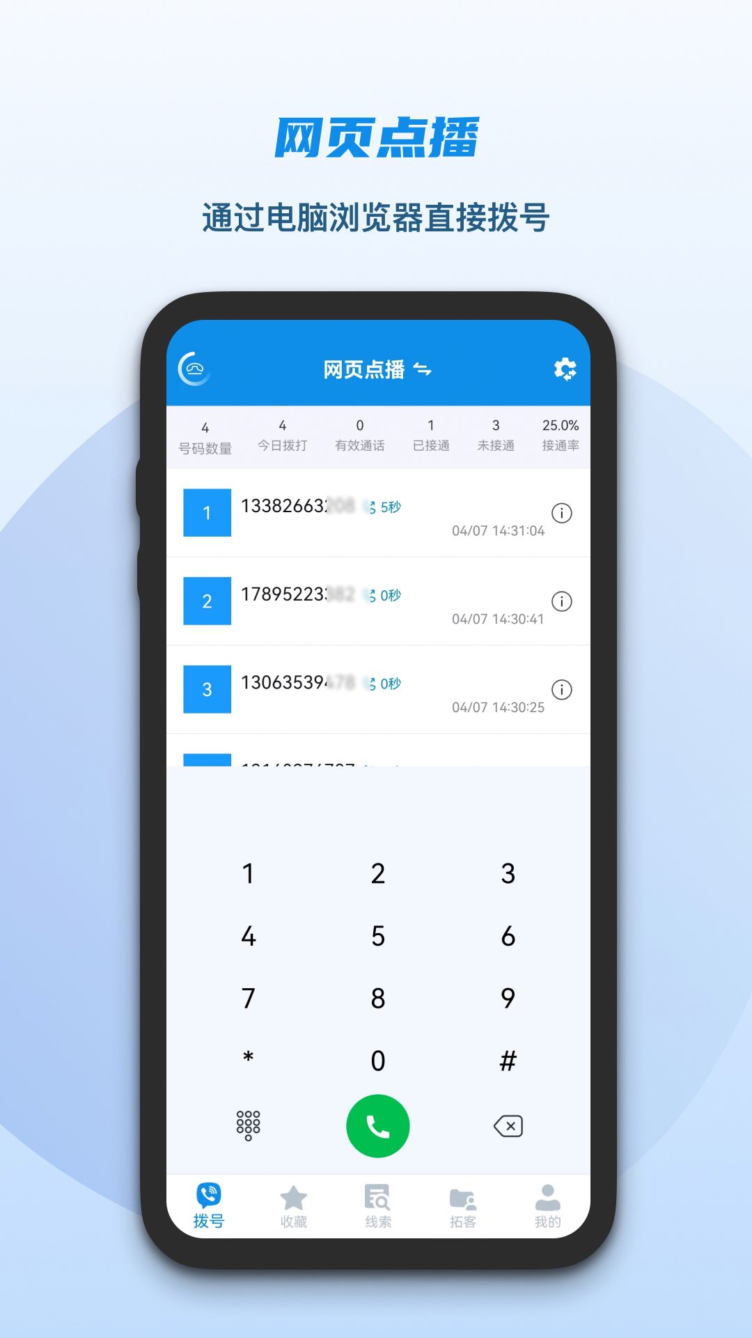 一键导入号码自动拨号,专业解决高频封号问题,包含黑名单检测、号码清洗、电销统计,客户管理等功能等,