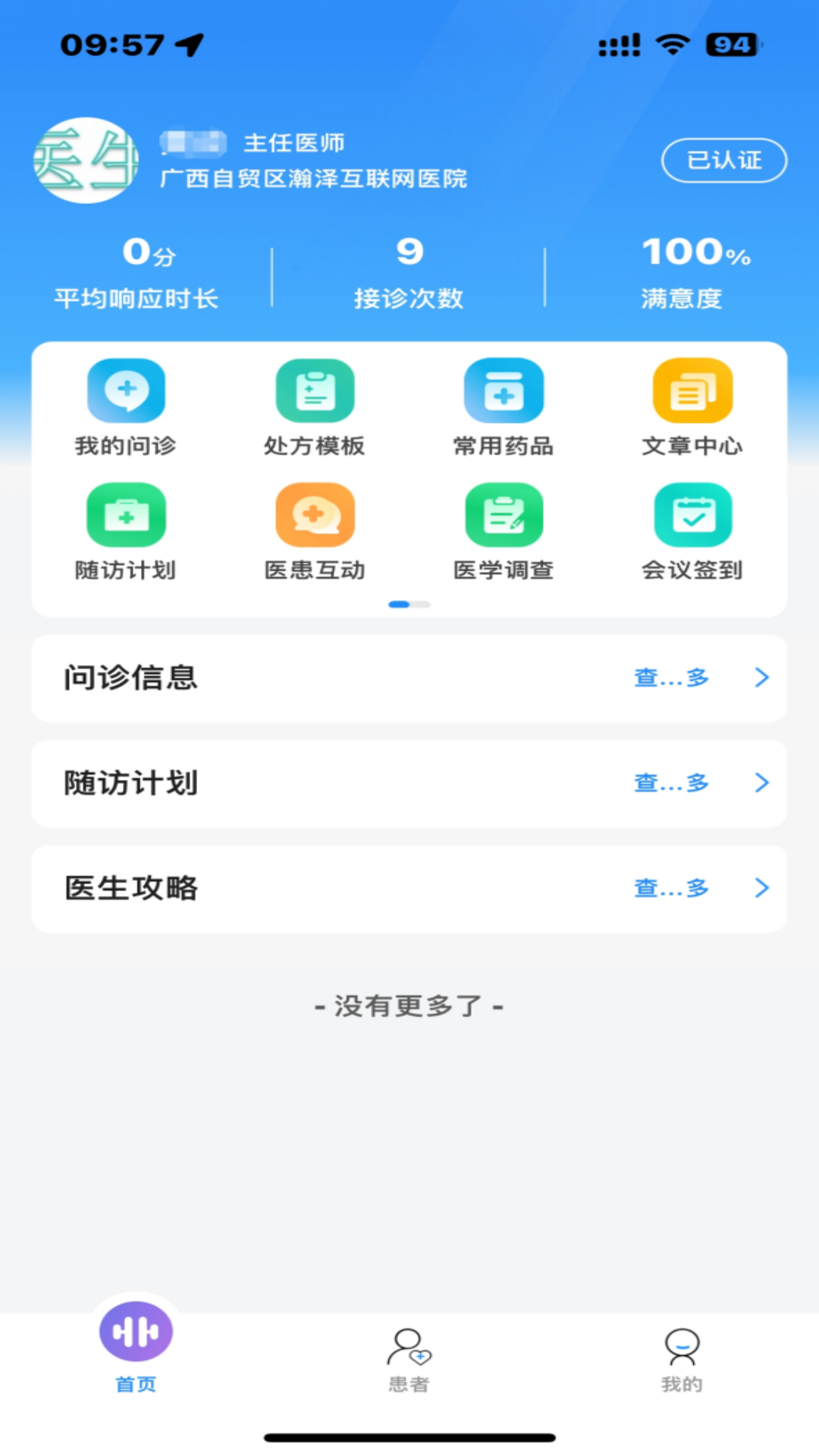 具体包括选择登录、接诊、处方模板、常用药品、文章中心、我的名片、病例征集、医学调查、会议签到、问诊信息、医生攻略、患者、我的、常用语管理、帮助与反馈、设置、通知提醒等功能。