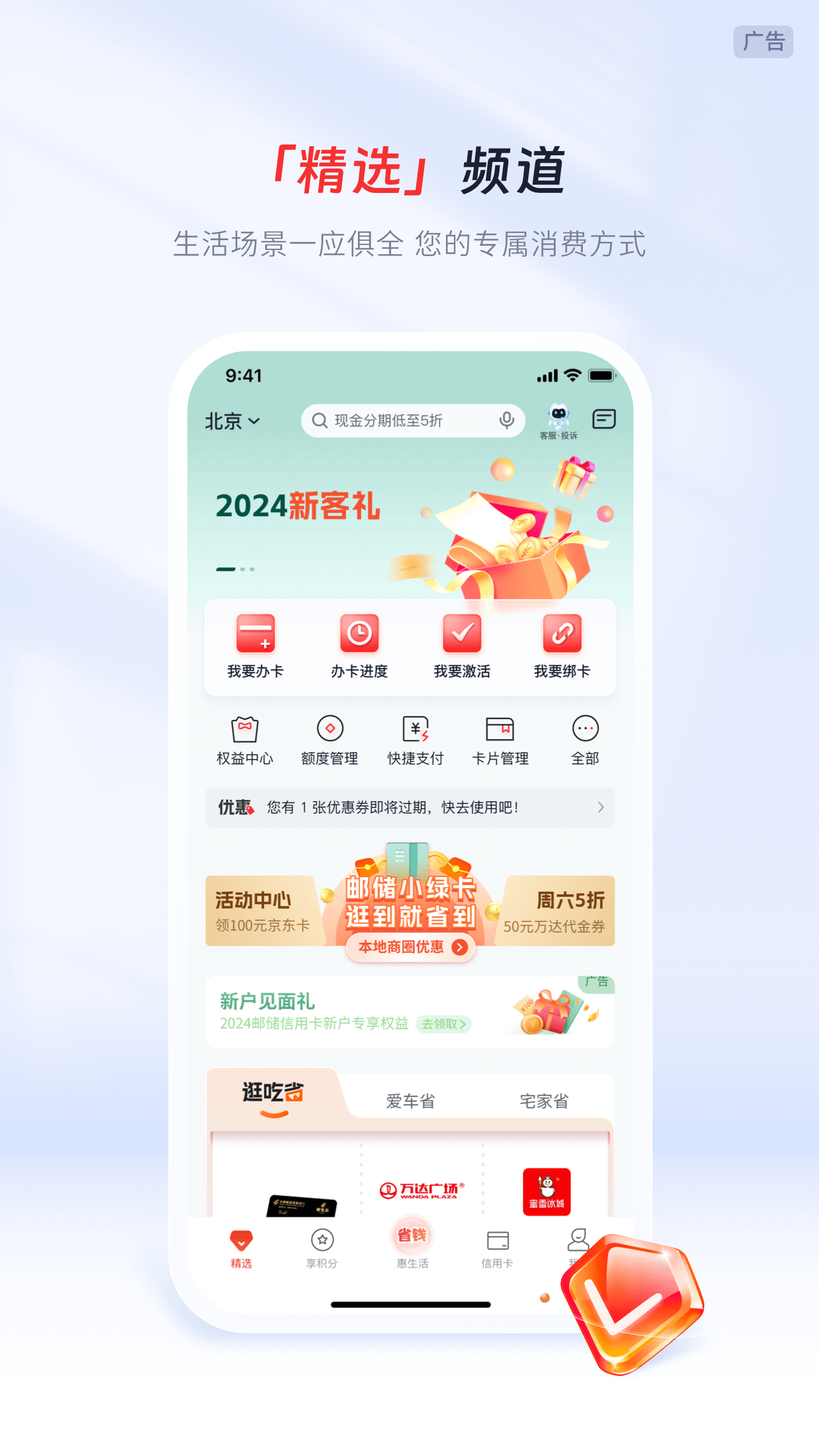 【精选】:这里生活场景应有尽有,“邮储小绿卡逛到就省到”、活动中心、选卡专区等,更多精彩等您来体验。