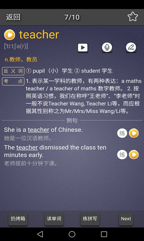 每日英语单词App为每个单词配题读音、例句、图解、视频、考点真题、短语、同义词、反义词、拼写易混淆词、趣味记词、英文释义等特色内容,在扎实学好每个单词的同时,兼顾了背单词的趣味性和文化拓展性,让学习单词成为一个享乐的过程。