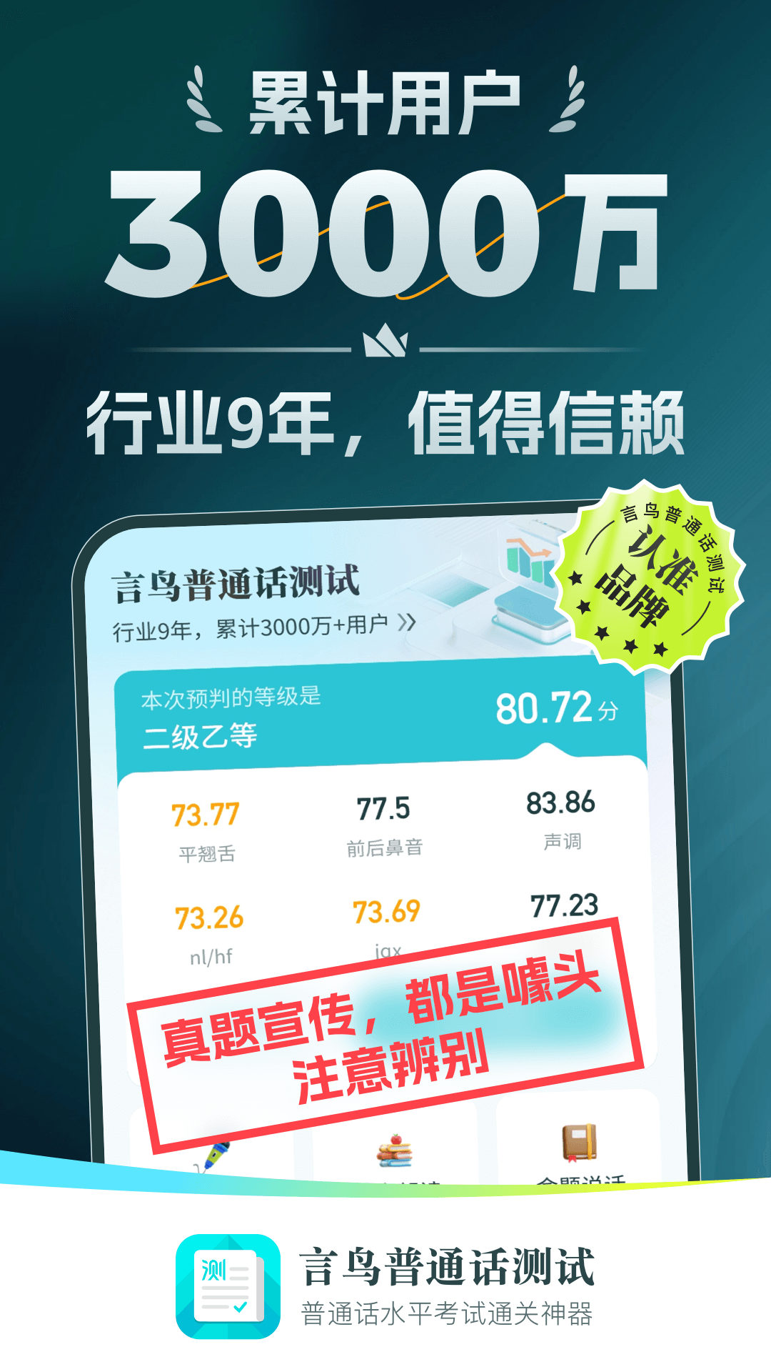你是否在为普通话等级考试发愁呢?这里有一款千万用户口碑推荐的普通话等级考试一站通关神器——普通话测试APP!它是言鸟普通话品牌旗下的产品,专为准备全国普通话水平测试考试的用户提供贴心服务。