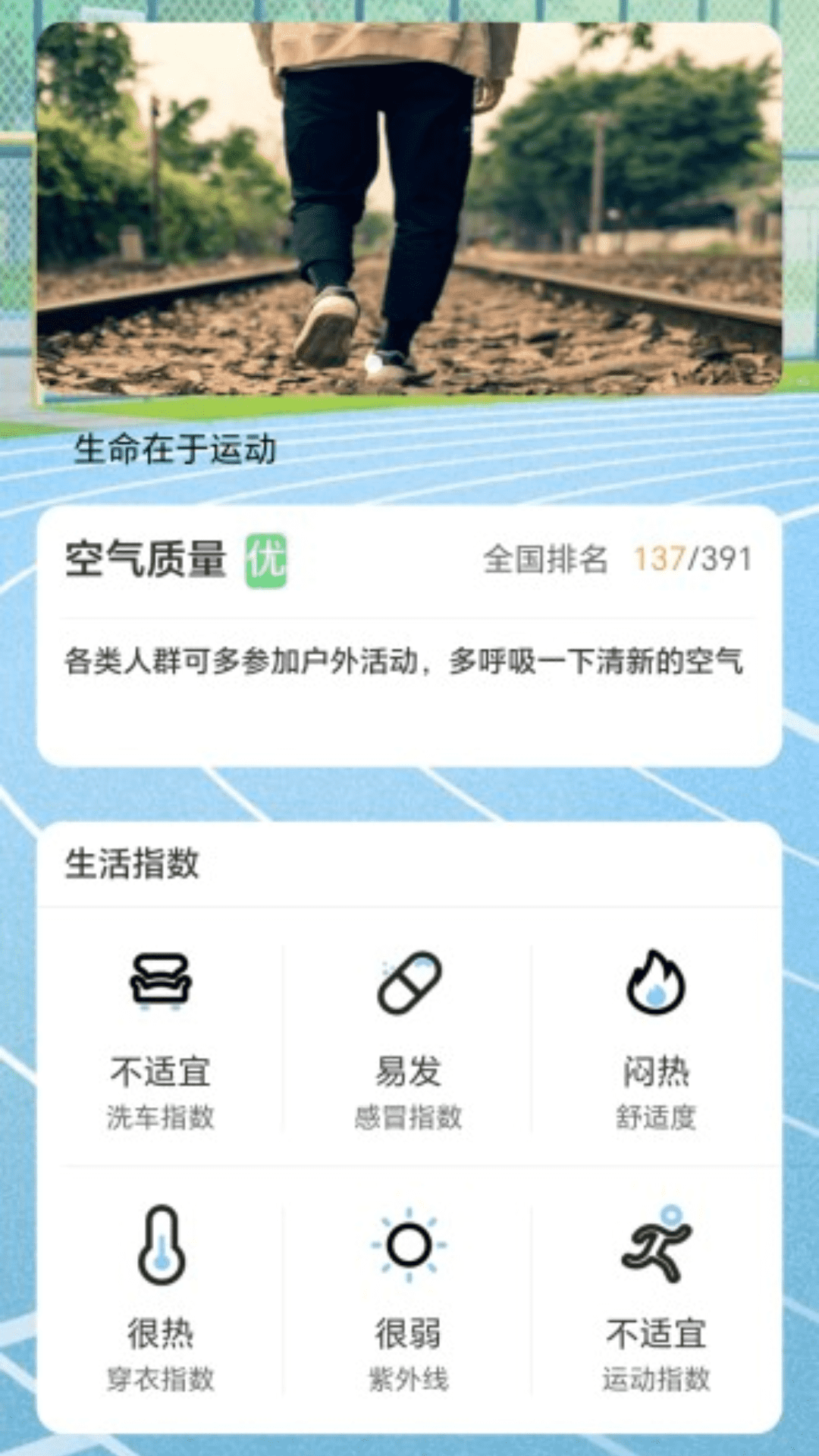 应用内设有实用工具,例如空气质量以及当日生活指数(像感冒指数、气候舒适度等)。这既满足了马拉松跑者或户外出行者的需求,避免不利天气对跑步表现产生影响,又能为日常生活提供方便,提升用户的生活体验。