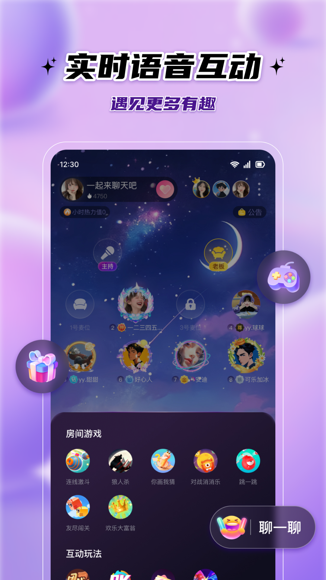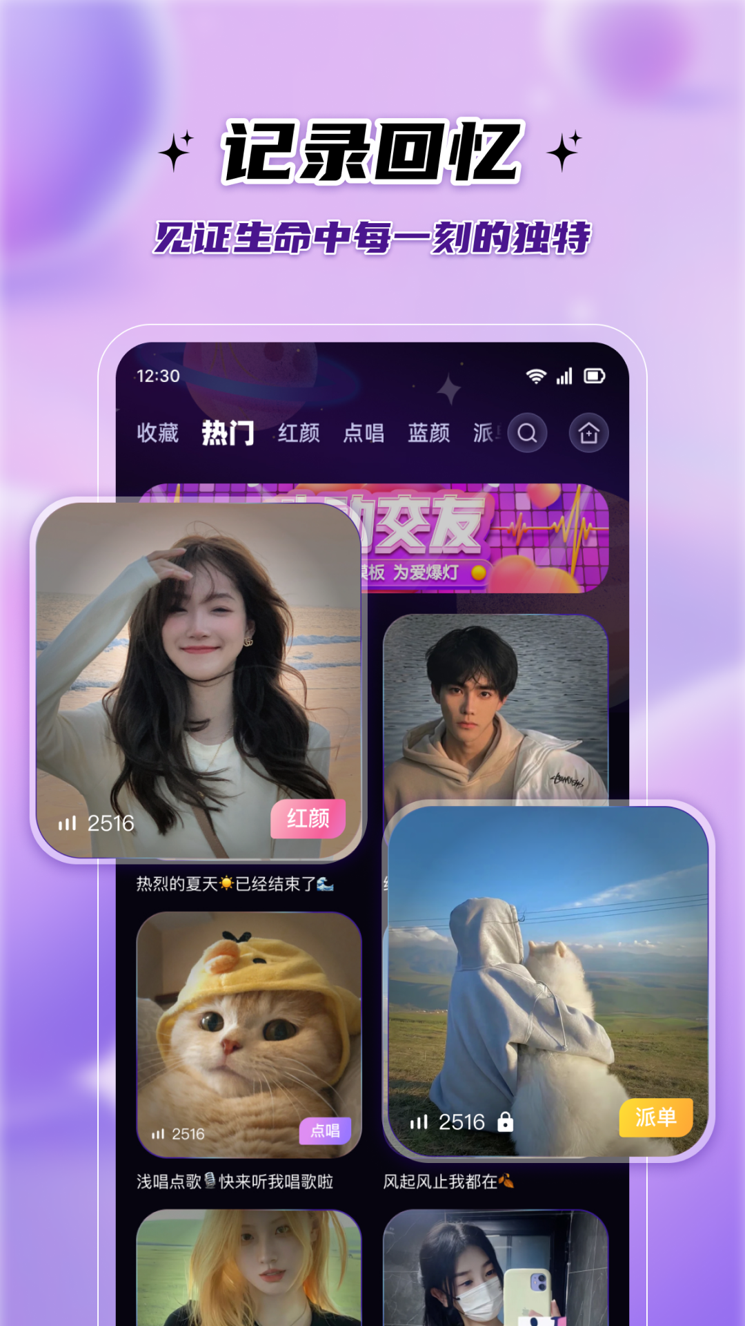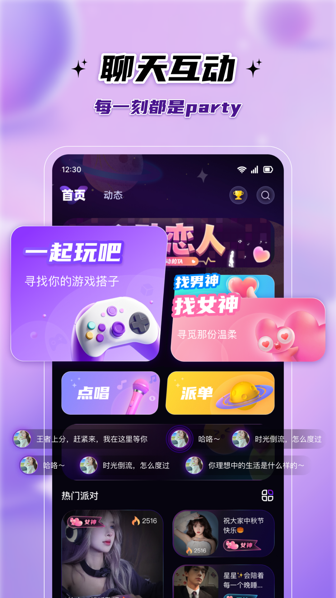 点歌、玩游戏、交友、拍拍等多种主题房间,可实现多人在线互动,快速帮助你找到契合的好友,处CP找玩伴,让关系更加纯粹~