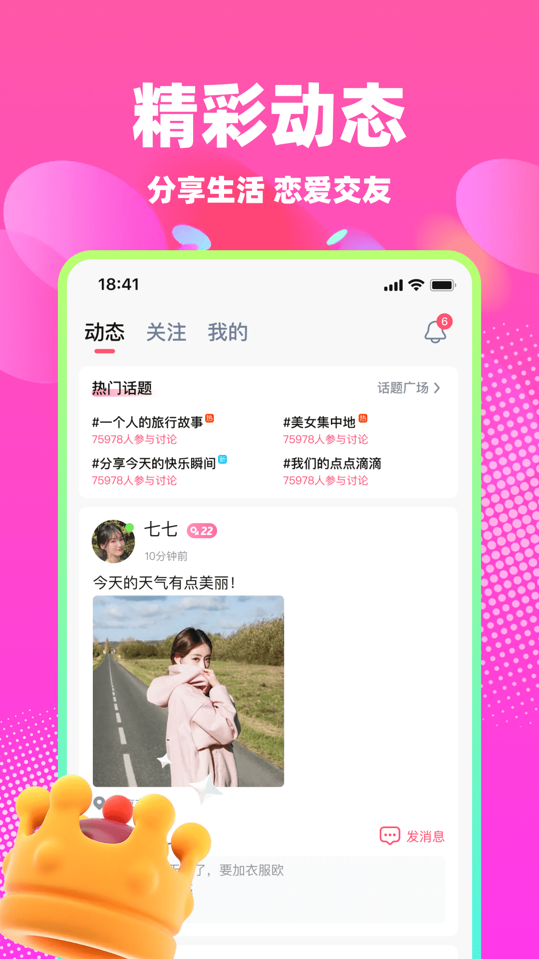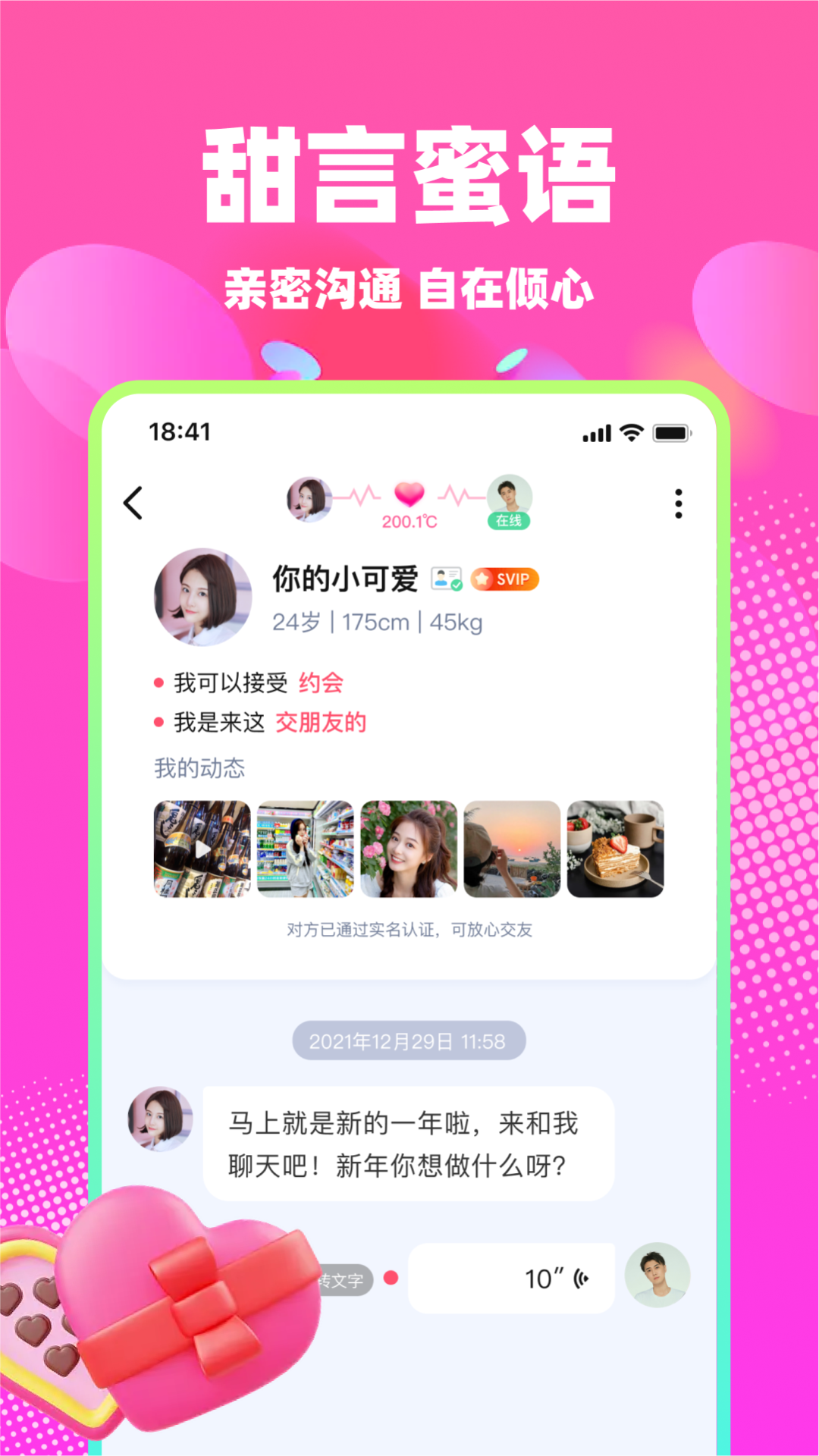 用视频、语音、文字等多种方式;动态、私聊多种场景互动,为用户创造更多交友机会~