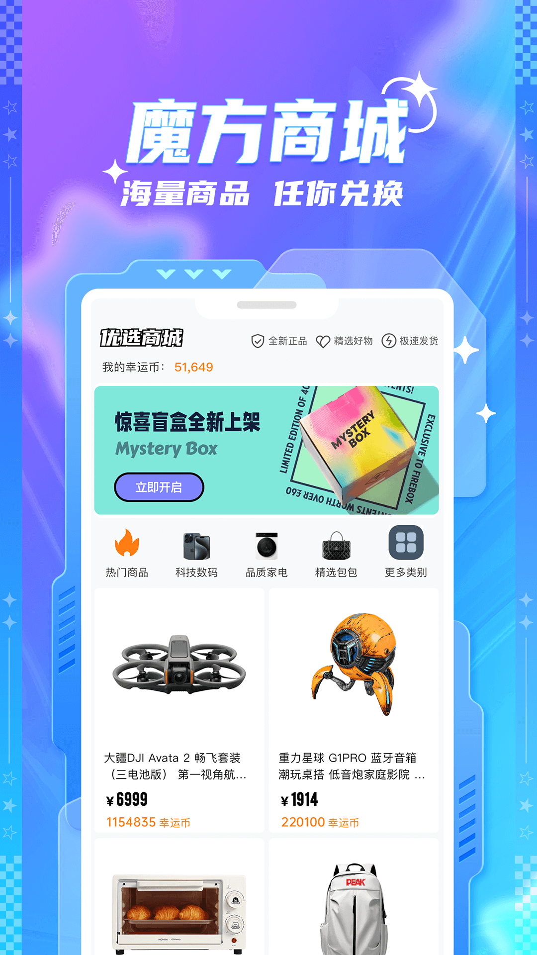 元魔方是一个能为玩家带来高品质服务与惊喜趣味购物体验的线上平台。在这里,有海量盲盒可供选择,其涵盖了超人气的潮玩手办、3C数码以及奢品美妆等众多品类。