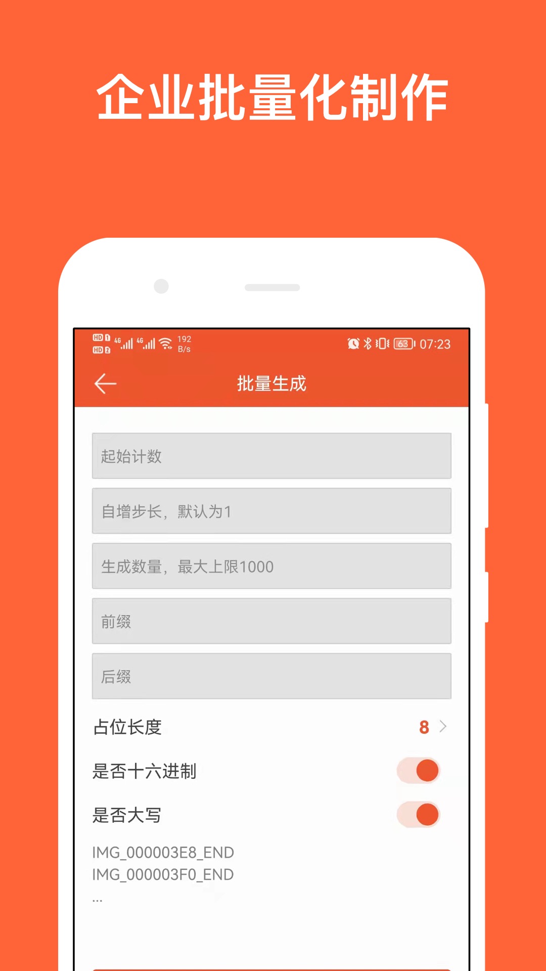 我们支持批量快速生成有自增规律的二维码,支持十进制与16进制的自增计算,为企业级工业产品制作二维码保驾护航,支持前缀、后缀等参数的插入,文件名自动对应内容,生成1000个二维码在不到一分钟时间内即可完成,可通过分享的方式批量压缩后发送到桌面