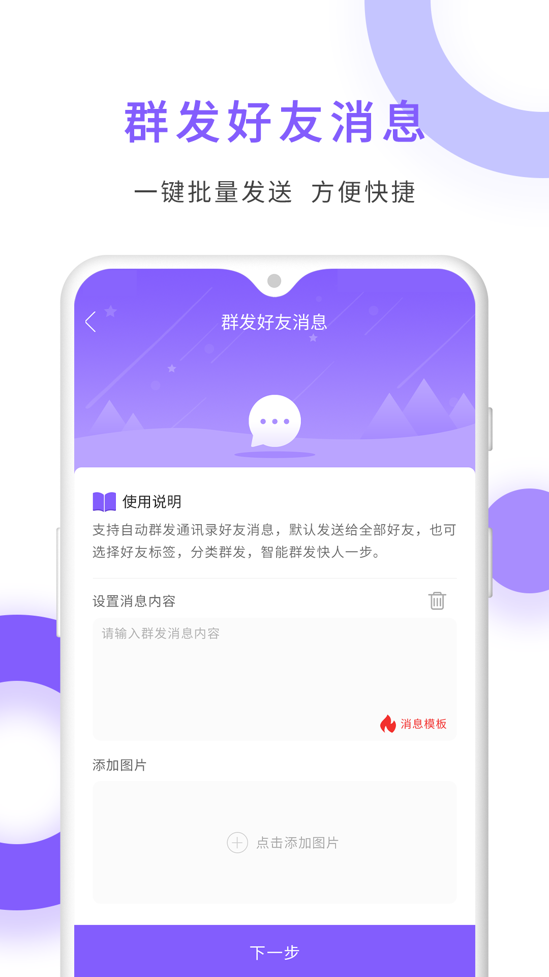1. 它就像是消息群发小达人一样,有了它,再也不用担心出现消息漏发或者错发这种令人尴尬的情况了。它可以自动把预先编辑好的消息群发给好友,还能进行分类群发呢,这种智能群发的方式让您在群发消息的时候抢占先机。