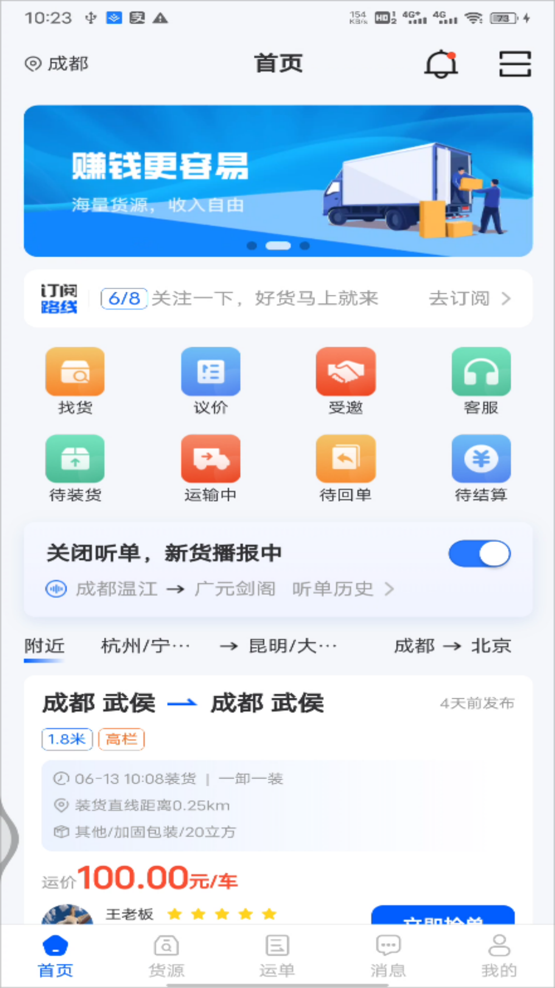 首页能够清晰呈现您的运输统计数据以及钱包余额,而且会实时推送周边货源信息。这样一来,您就能时刻洞悉全局,在瞬息万变的市场中及时抓住每一个商机。