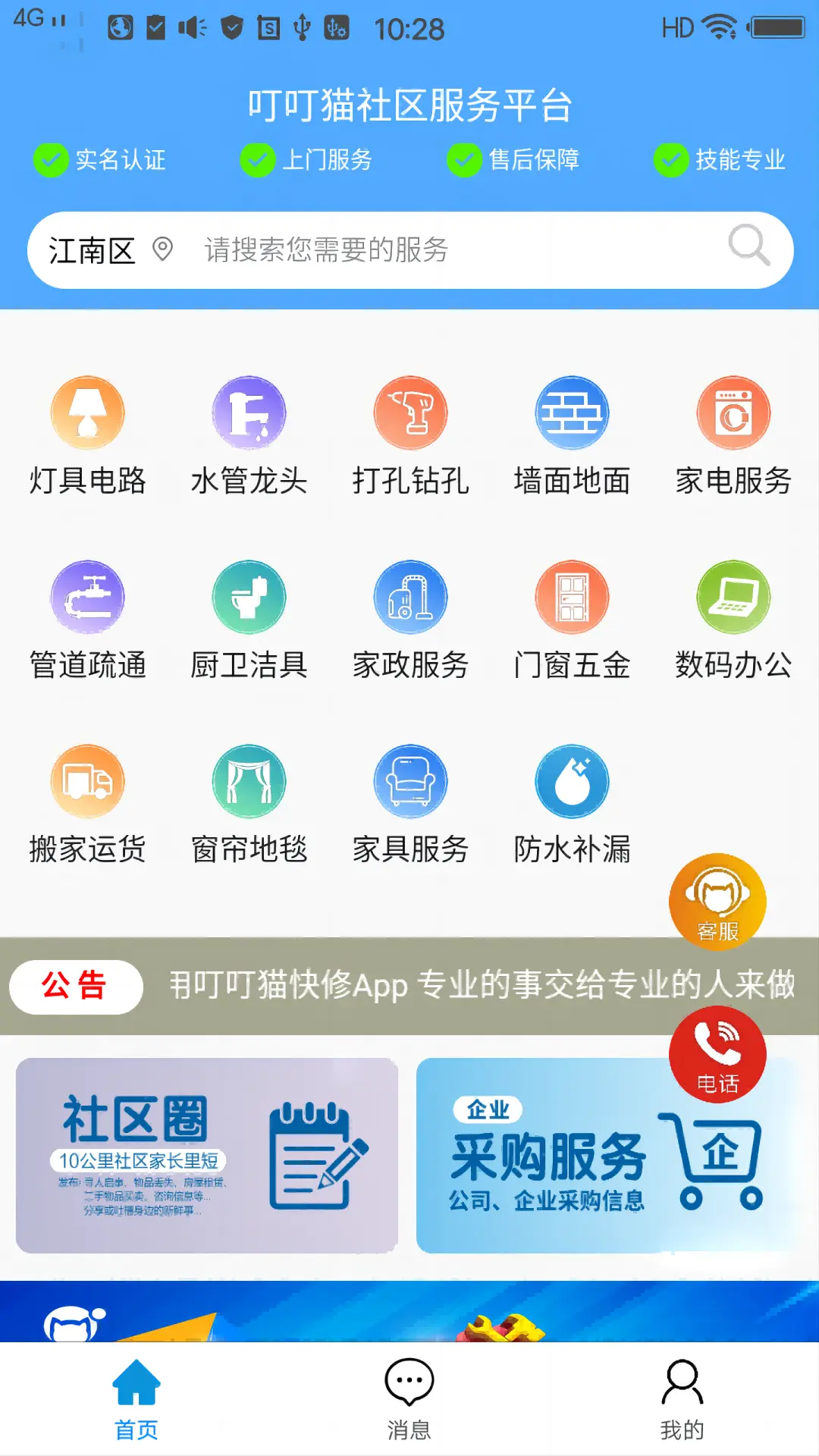 叮叮猫快修作为一站式数字化维修服务企业,提供家电维修、家电清洗、水电维修、管道疏通、防水补漏、墙面翻新、日常保洁、开荒保洁、钟点工、御厨到家、搬家、甲醛检测治理、月嫂、催乳师、育儿嫂、保姆、社区承包、服务行业融合等多元化维修上门服务平台。