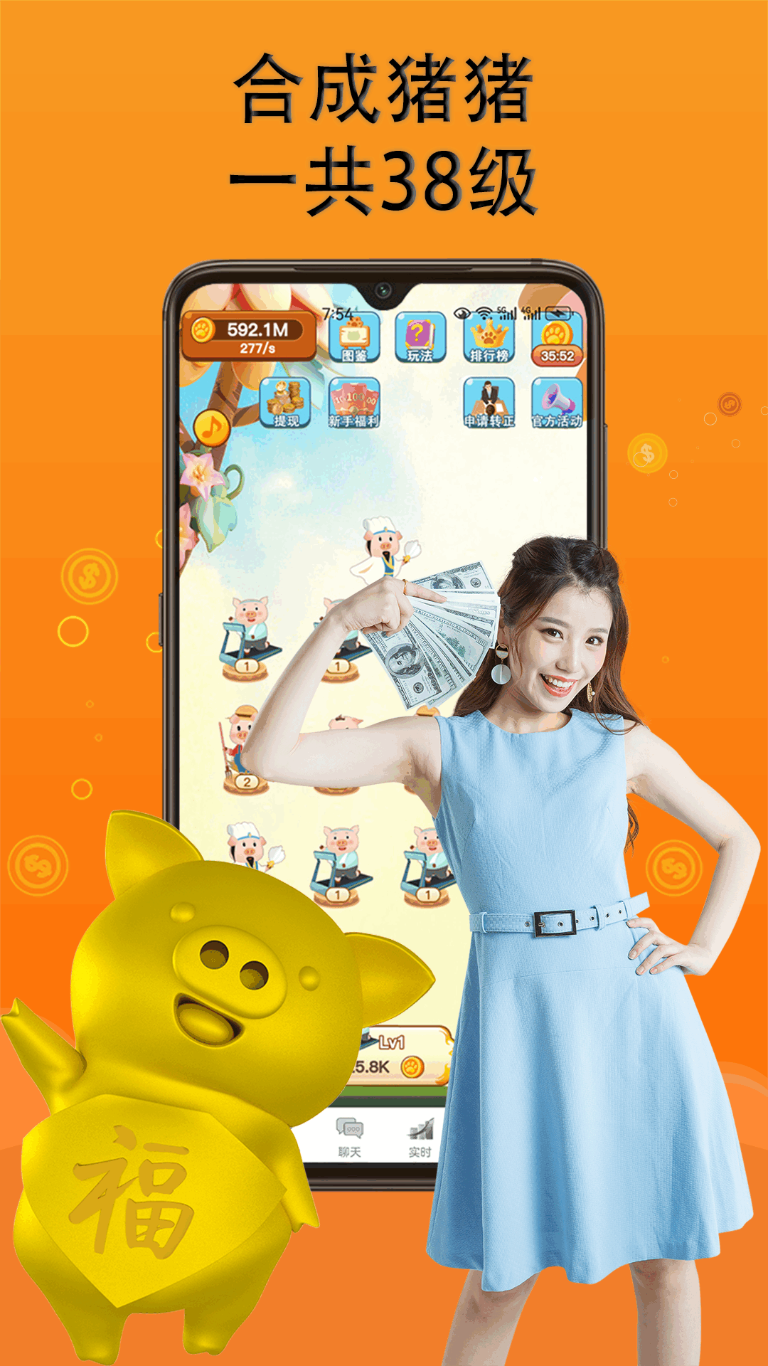 我们的猪猪设定为一共38个等级。每两只相同等级的猪猪,就能够合成一只更高等级的猪。每次猪猪成功升级的时候,都可以获得0.1元及以上的现金红包,而且还有机会随机得到限时的金色分红猪呢!