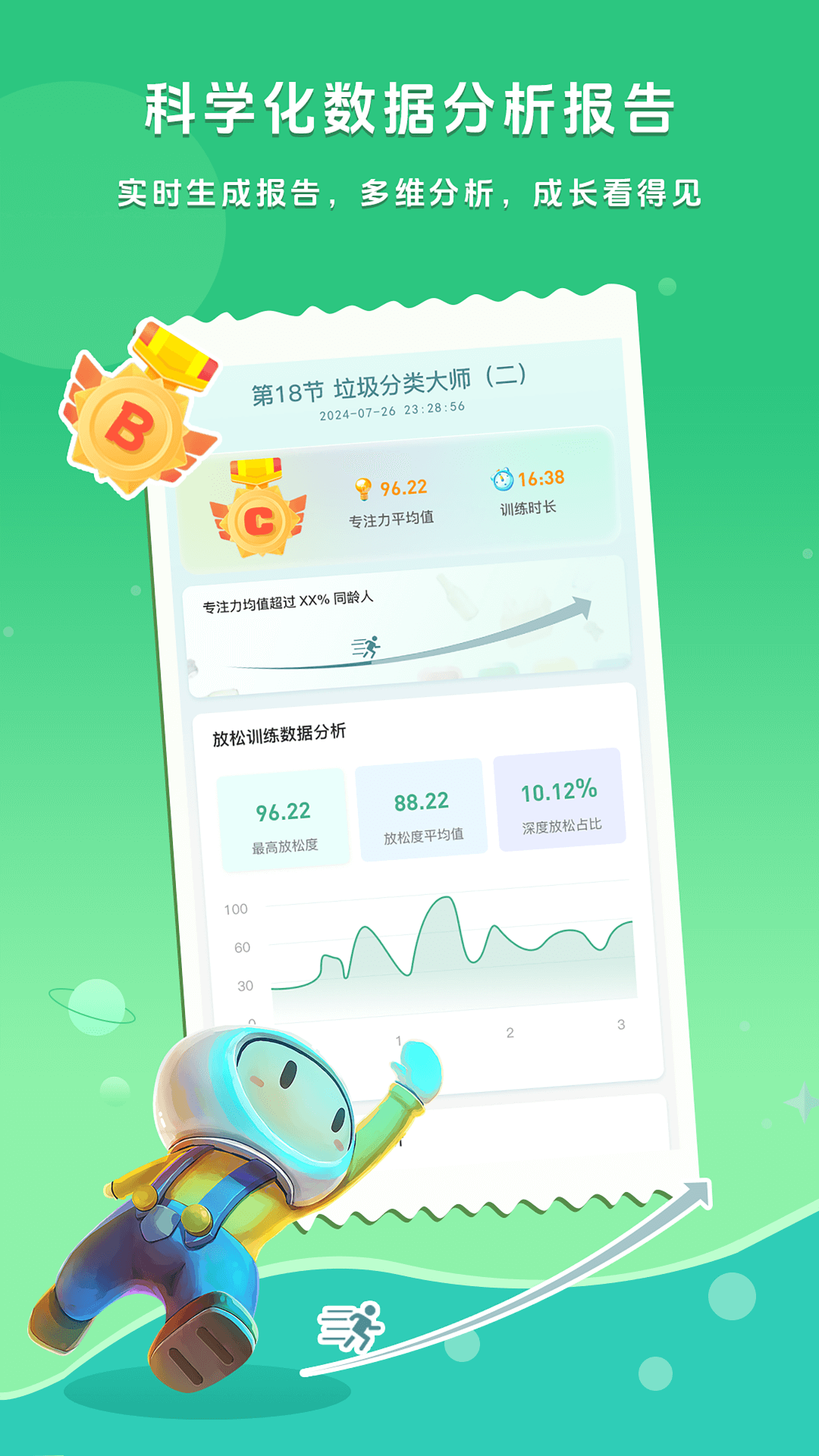 在训练结束之后,会生成一份内容全面、维度多元的解析报告。通过科学化的数据分析方法,深入分析用户的训练表现,为用户提供极具个性化的优化建议,持续提升用户的专注力,让成长的轨迹清晰可见。