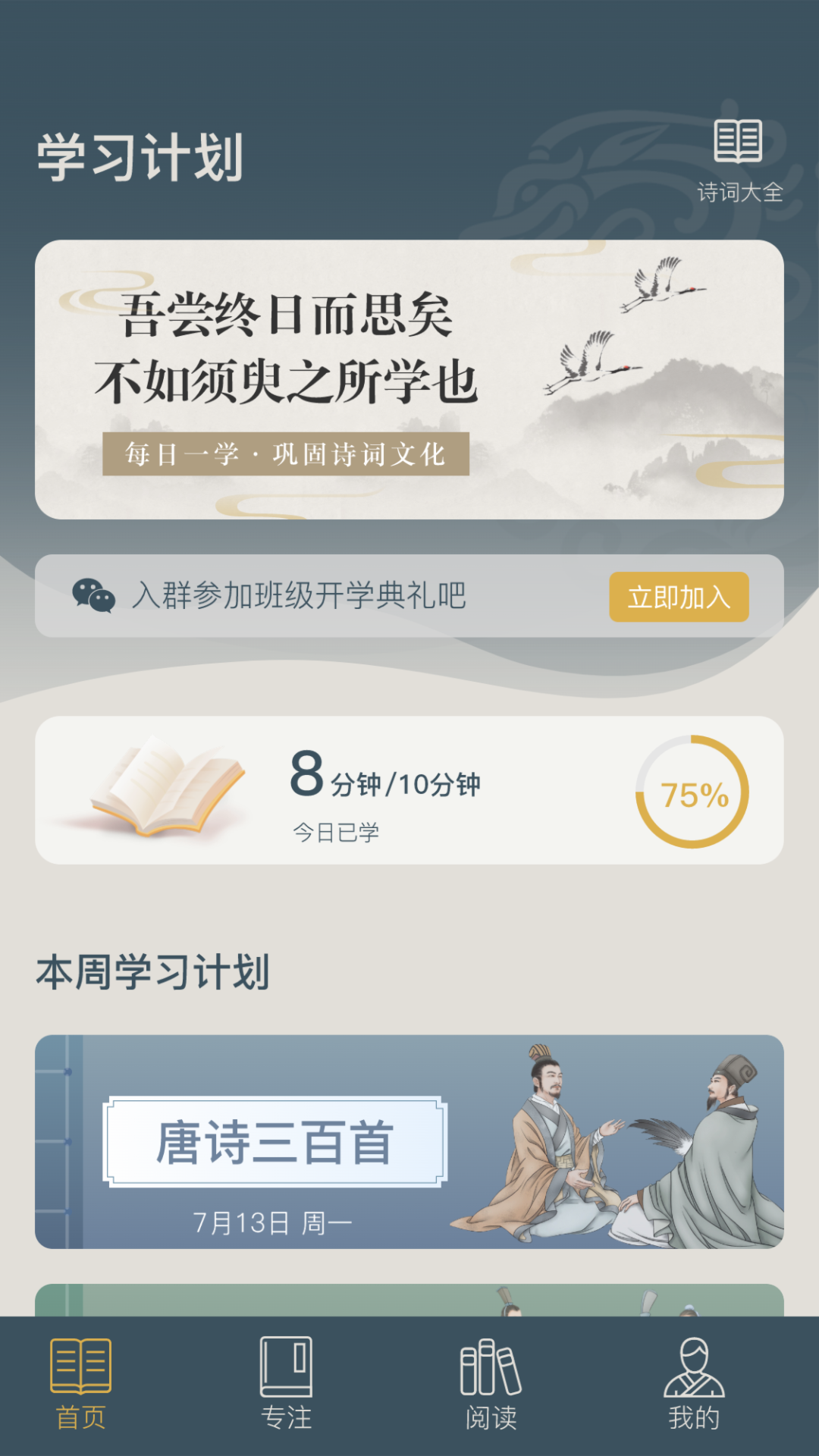 2.每周学习计划:给用户设定每周诗词学习计划,每天学习不同的古诗词曲,坚持学习打卡,生词本可以更好地帮助用户进行学习巩固。
