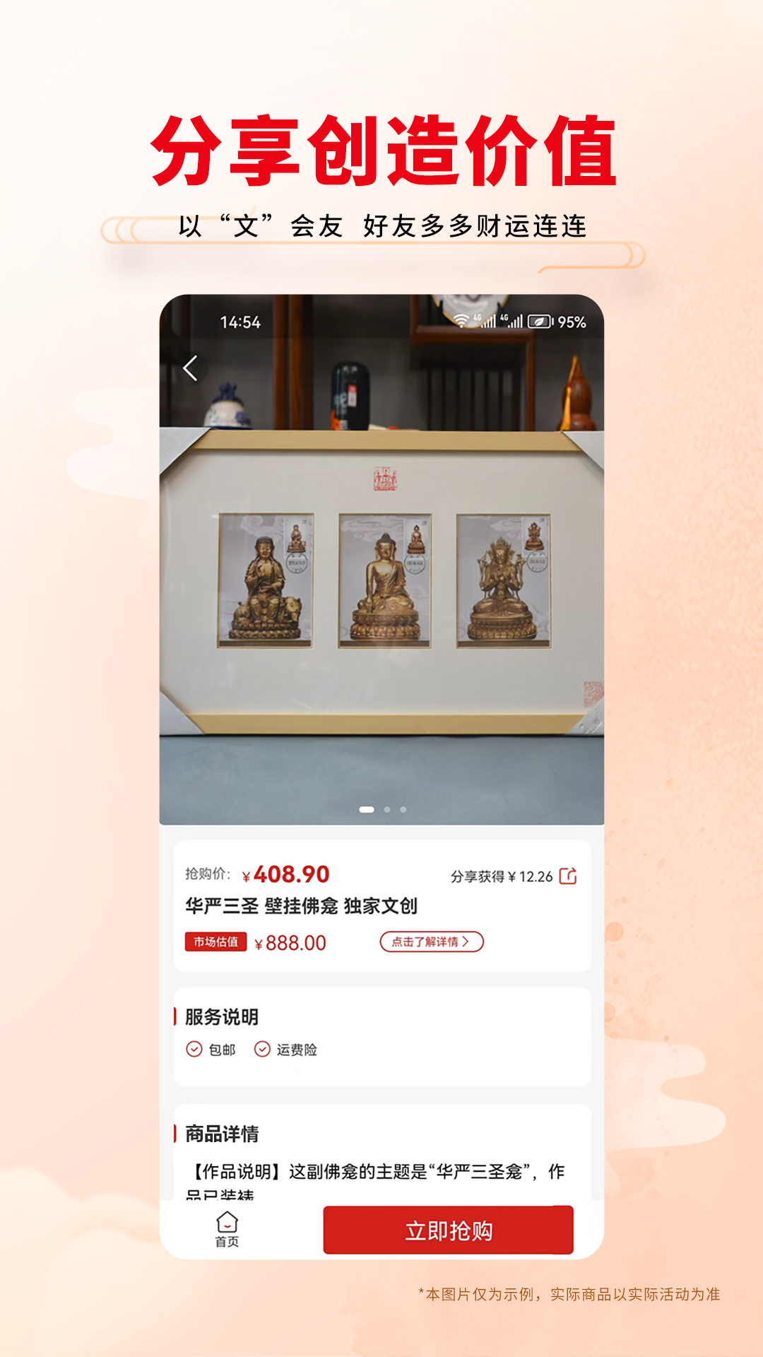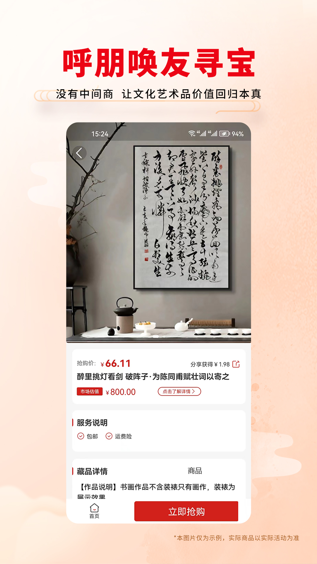 在商业服务方面,为消费者提供针对文化艺术品类的多种服务,包括购买、转手以及寄卖等。同时,它还涉足各类工艺美术品的销售业务,像书画、陶瓷、雕刻等精美工艺品都在销售之列,并且还包括非遗传承制品以及农村民间工艺及制品的销售。