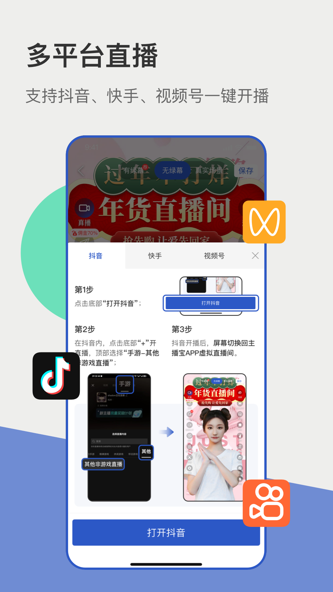 主播宝十分强大,支持在抖音、快手和视频号这几个热门平台一键开播,让您的直播能够覆盖更多的受众。