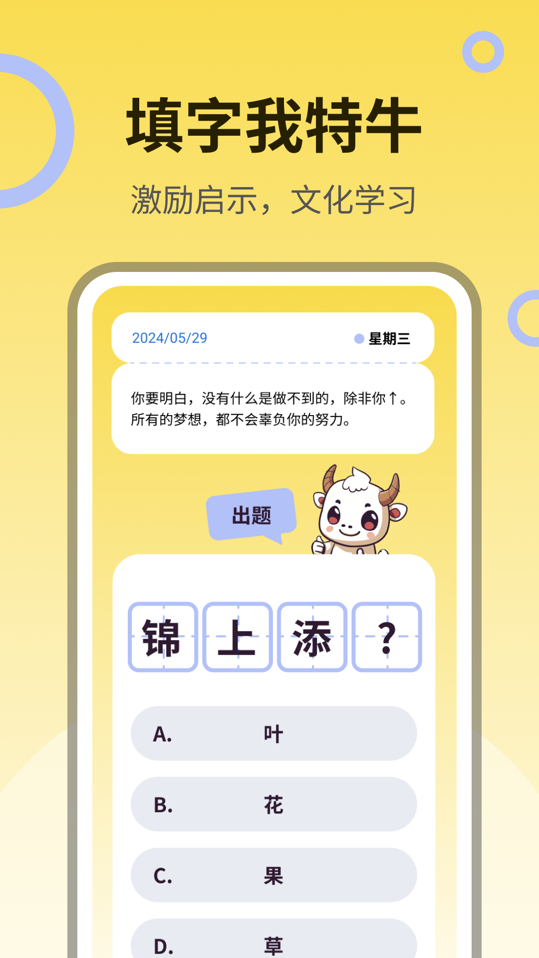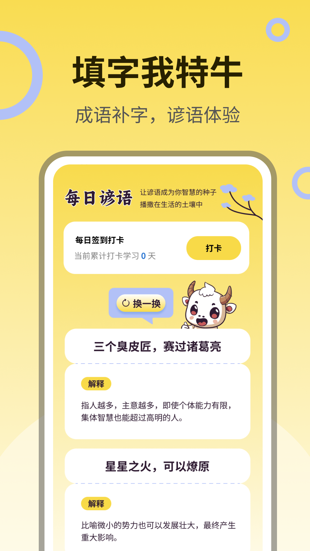 “填字我特牛”是一款结合文化学习与日常启示的多功能应用程序。通过每日一则心灵鸡汤,为用户提供日常激励,同时通过成语补字答题和每日一则谚语,增强用户的语言技能和文化理解。此外,应用还特别设计了成语释义模块,让用户通过“换一换”功能轻松学习新成语。界面中小牛气泡式的标题增添了趣味性和互动性,使学习过程既愉快又充满挑战。这款应用是学习中国语言和文化的理想选择,适合所有年龄层的用户。