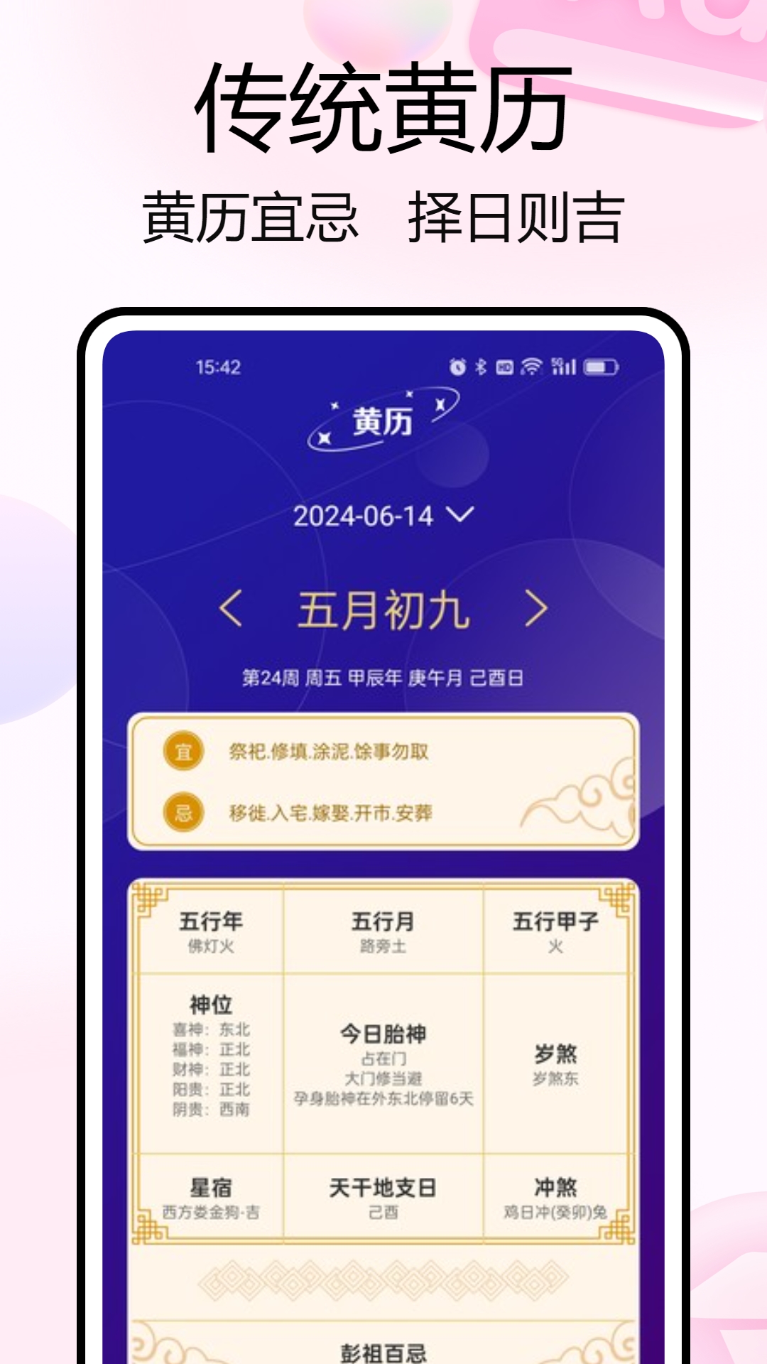 1. 黄历宜忌、节日节气以及吉日查询:通过该功能,用户能够查看每日的运势以及运势分析结果,从而轻松掌握每天的运势走向。