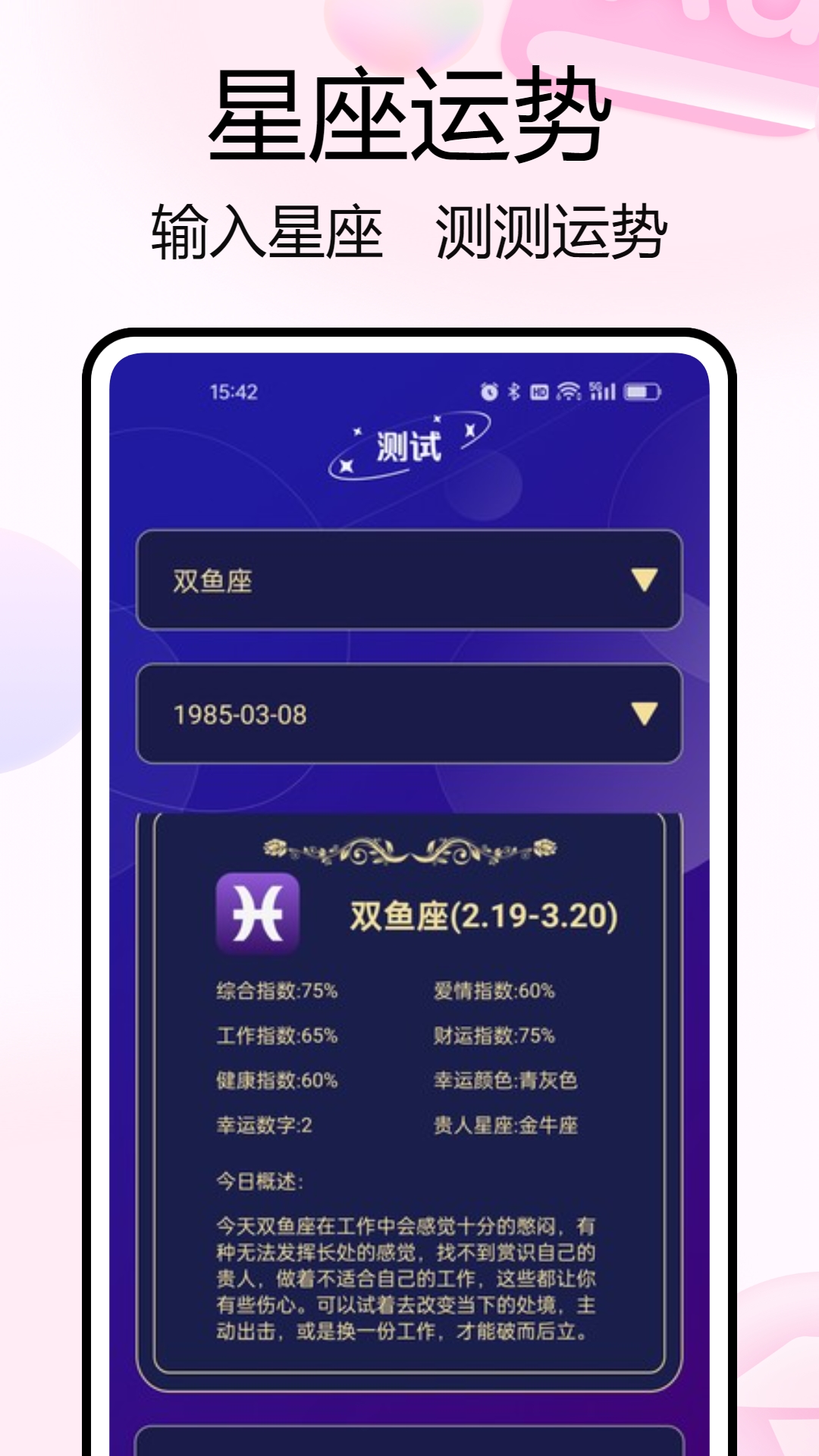2. 星座运势查询与个人解读:用户输入出生时间后,各种相关参数会在线清晰展示,这有助于用户更好地了解自己的性格与潜力。