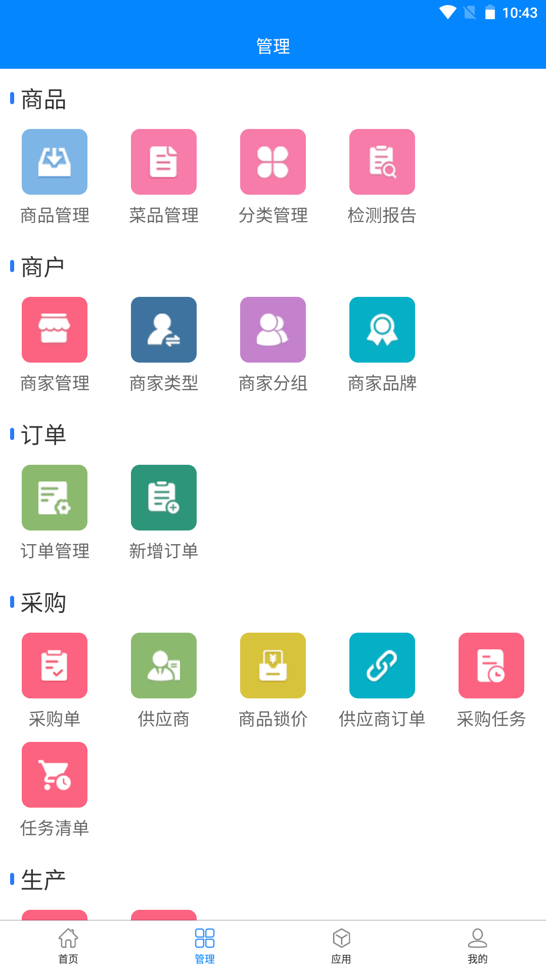 包含采购、商品、仓储、商户、物流配送等管理模块,支持采购调价、上传检疫报告、编辑商品信息,仓储、生产任务分配、查看订单信息