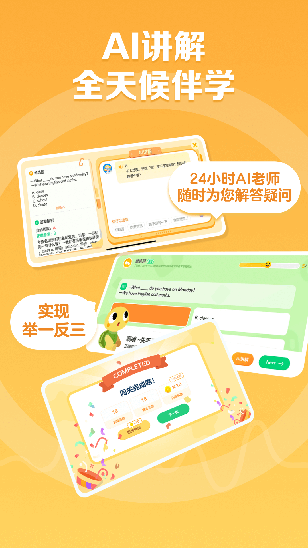 一款专为小学生打造的教材同步学习必备工具。课后知识点练习的同时,搭配专属AI讲解老师,更加高效快速掌握知识点!通过五步学习法,在学练结合的场景下,形成科学学习闭环。随着练习答题通关后,还可收获成套卡牌,趣味带打动学习!
