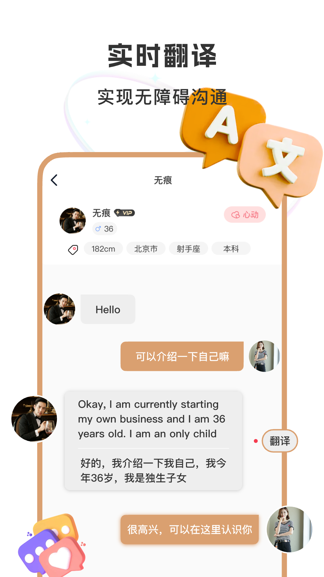 即时翻译无障碍沟通: 内置自动翻译功能让你无论身处何地都能畅通无阻地与全球优质单身沟通,消除语言障碍,真正做到交友无国界。