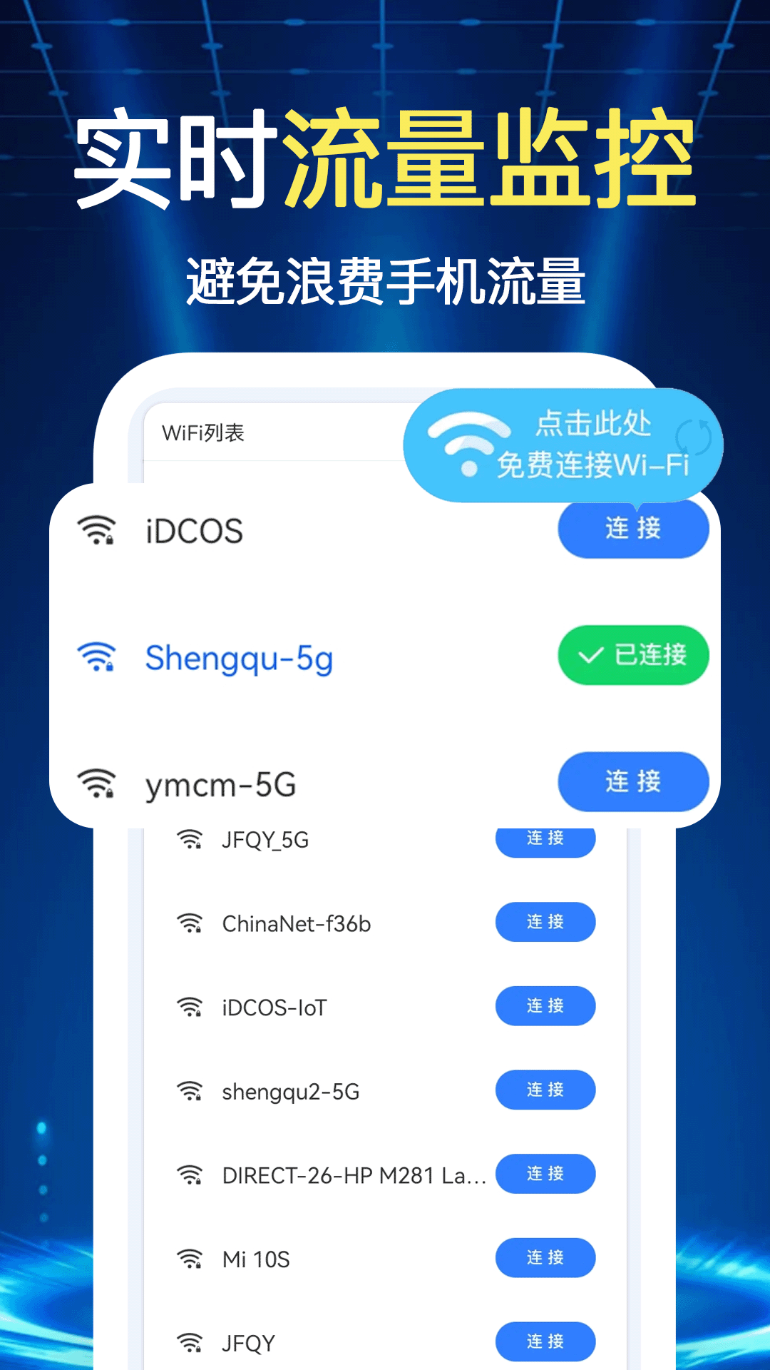 [首页] 用户可以打开WiFi,查询WiFi列表,并且测出当前连接WiFi的网速、查看当前连接WiFi的设备防止蹭网、查看WiFi安全等多种功能,为用户的WiFi安全和速度保驾护航