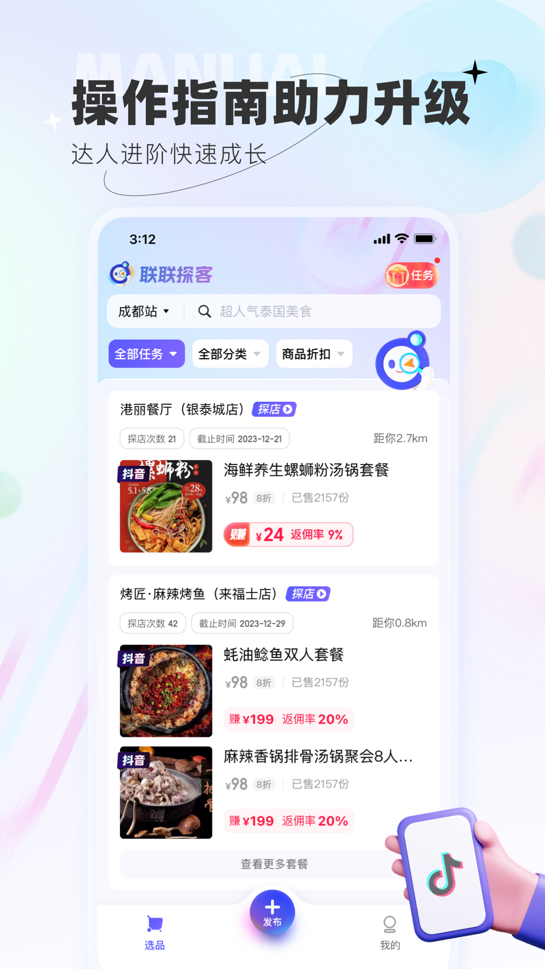 【联联探客APP】是千万本地生活达人创造内容、探店种草分享挣得佣金的平台。包含吃喝玩乐高佣任务,多平台内容分发赚取佣金,达人等级。