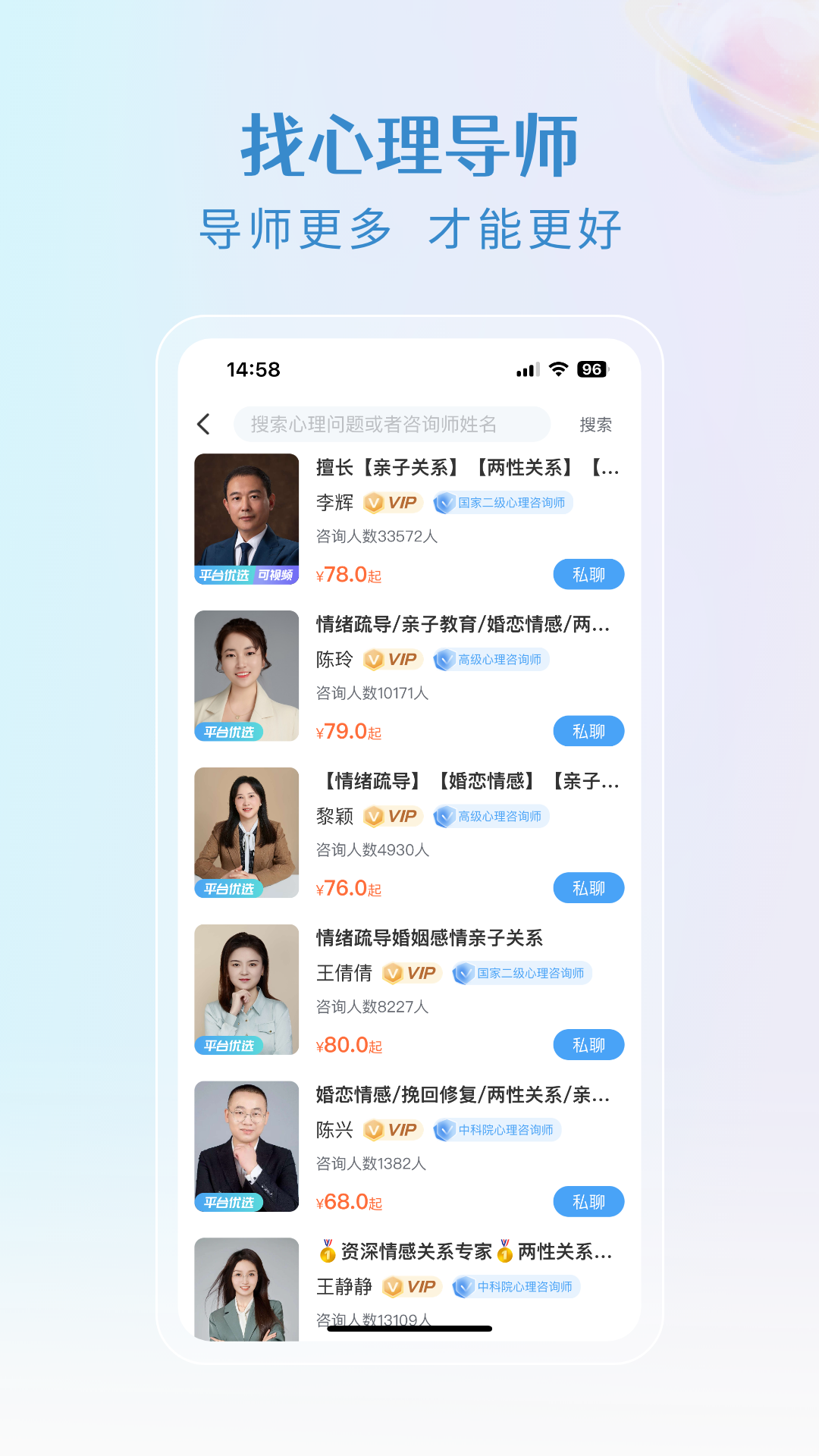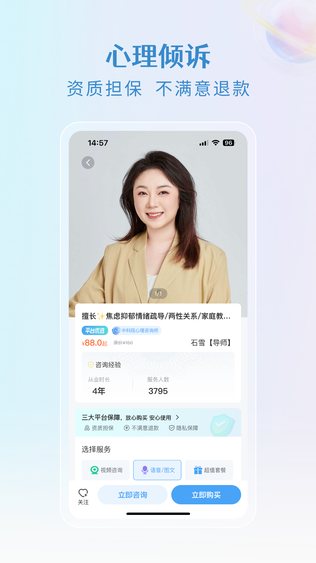 用户可在央心倾诉心理咨询APP上在线预约专业的心理导师,然后进行实时的语音、视频或者文字交流。这里的咨询师都有着丰富的心理辅导经验,他们能够为用户提供具有针对性的心理建议,助力用户化解心理难题,引导用户摆脱困境。