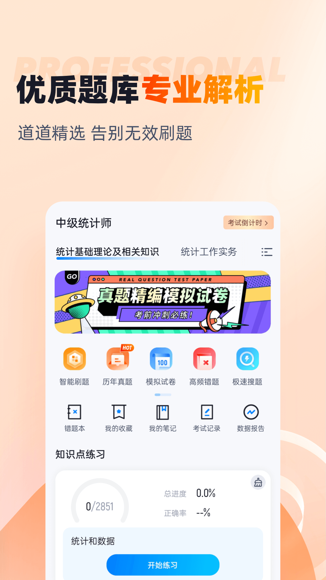 中级统计师APP增添了模拟考试功能。中级统计师考生可以根据自己练习的考点来选择与之对应的模拟试卷,也能够选择已经搭配好的模拟整卷进行考试,为考生提供了多样化的模拟考试选择。