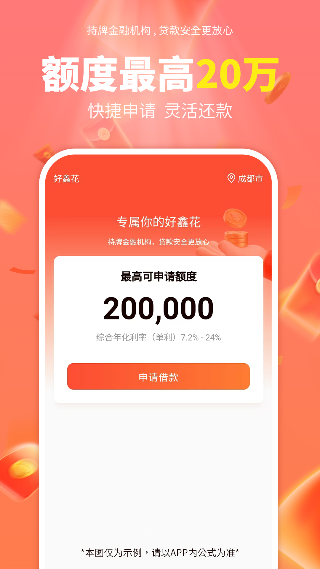 好鑫花致力于通过科技提高金融服务的品质与效率,实现“科技助力金融机构 智慧改变信用生活”的使命,为有需求的用户提供方便、稳定、便捷的金融借款服务,可以分6-24期还款。申请便捷,全程手机操作!