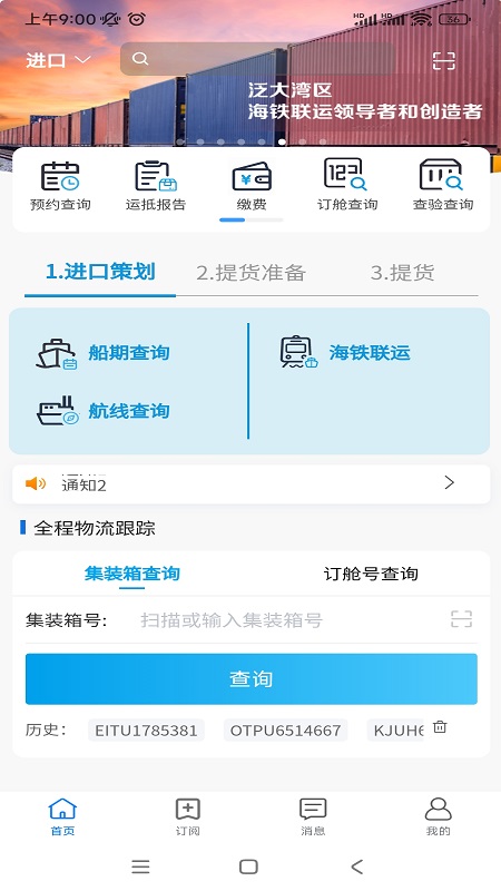 - 包含集装箱订阅和船期订阅。对于未到港或者在场的集装箱,用户能够提前订阅其状态数据。当被订阅的集装箱信息更新时,手机APP会及时把信息推送给客户。这些信息节点涵盖集装箱到港、放行、离港等情况;对于组合港的集装箱,信息节点还包括进闸、放行、装船、到港、离港。在订阅船期后,系统可展示船舶的到港和离港节点。
