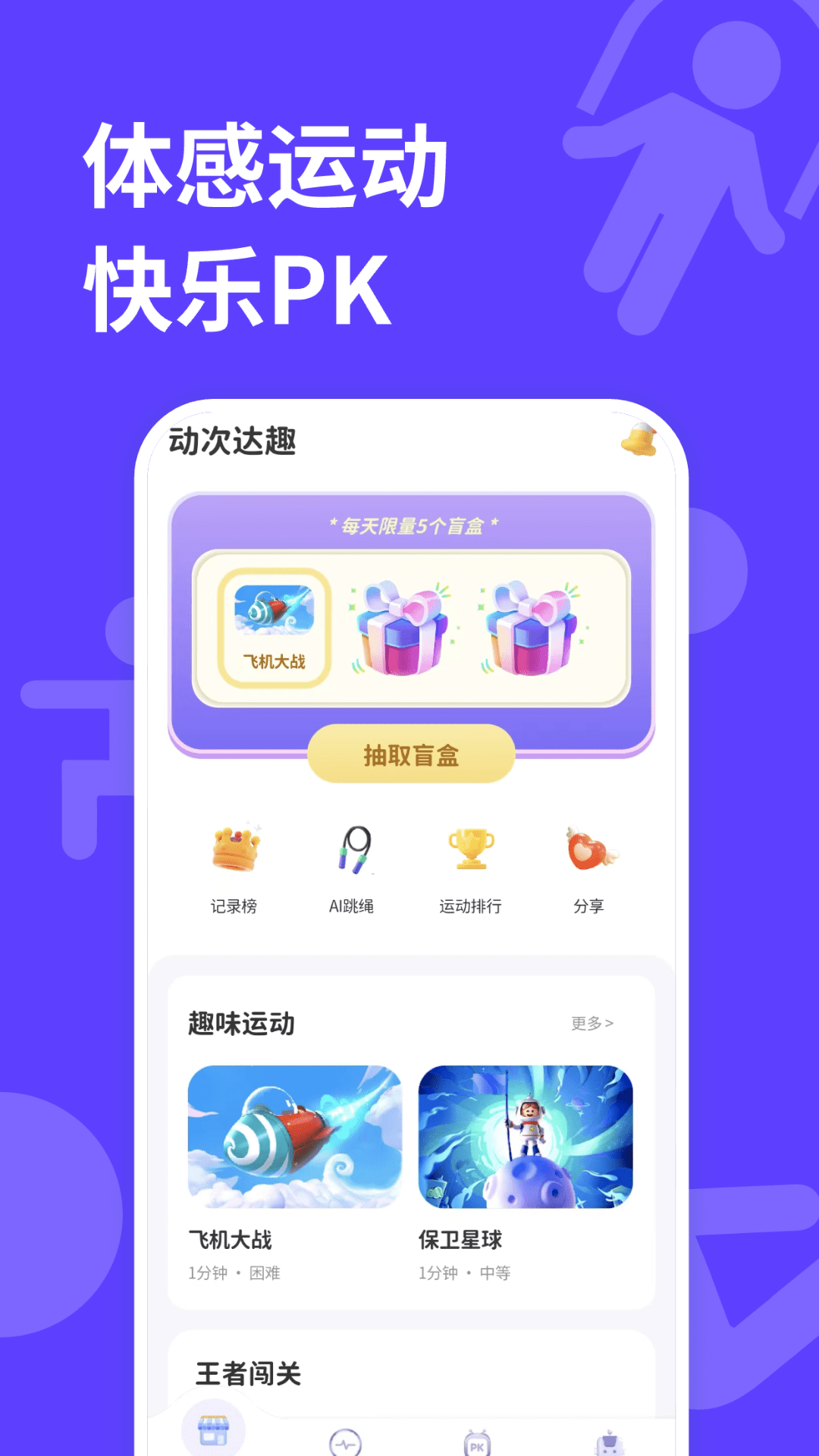 #趣味运动:拥有多种游戏模式,趣味闯关,在不知不觉中燃烧你的卡路里。另外设有好友PK挑战赛,在游戏中和好友联络感情的同时一起变得更好!