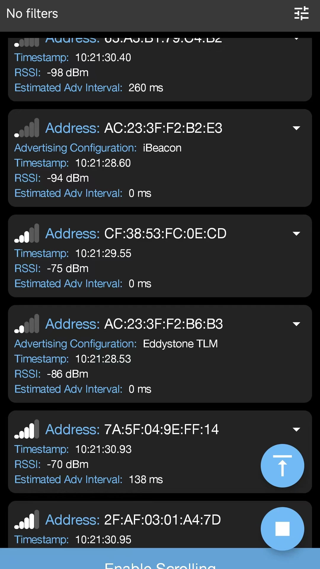 NanoBeacon BLE Scanner是一款定制的移动应用程序。借助该程序,您能够扫描并找到自己的NanoBeacon IN100设备,同时它会以一种易于读取的格式来展示设备的广播数据。如此一来,您就可以将精力集中在应用程序本身,无需再为解析原始广播数据字节这种既无意义又耗时的任务而烦恼。