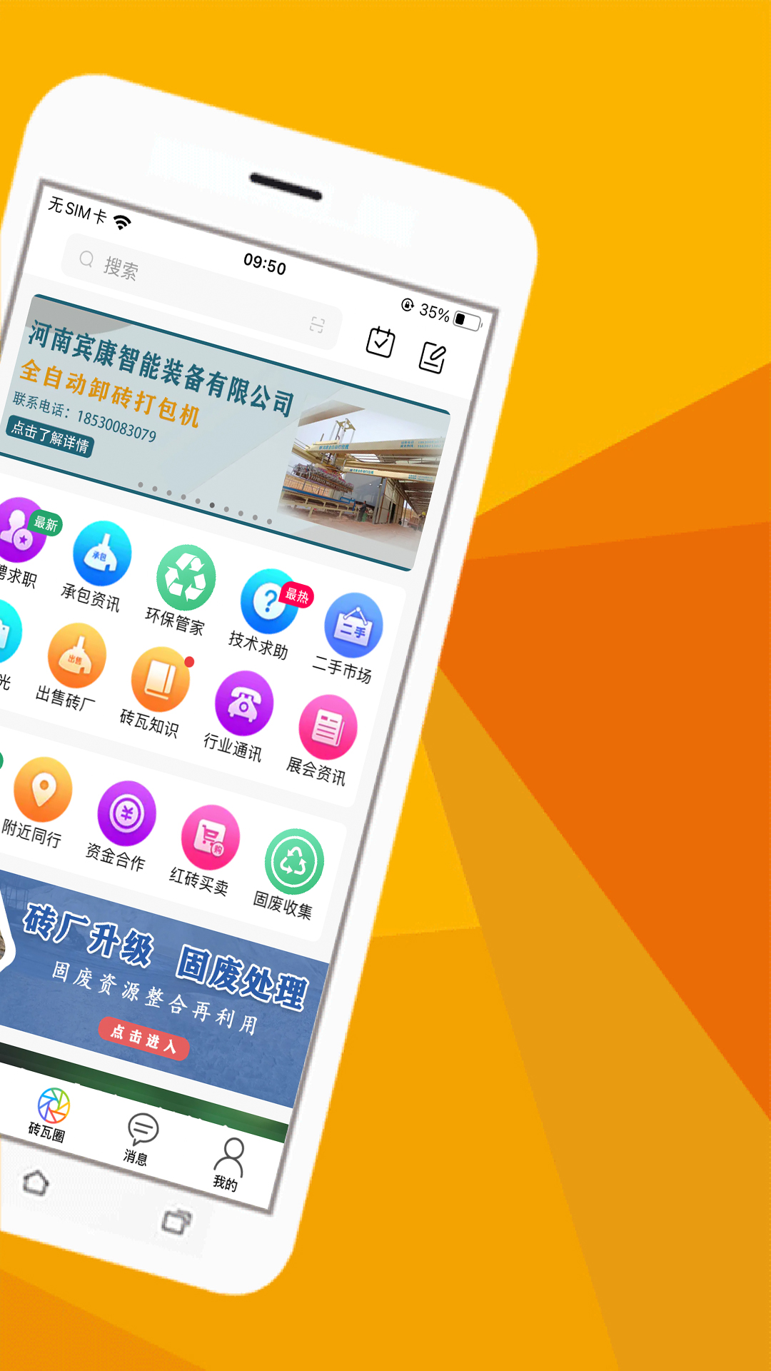 砖瓦平台是一款手机应用软件,能为砖瓦行业的线上互联网信息提供一站式服务。在这个平台上,您每日都可查看行业新闻与动态,发布招聘或求职信息,进行新旧设备的交易,针对生产和设备方面的问题寻求帮助,还能找寻附近的朋友以及同行伙伴。