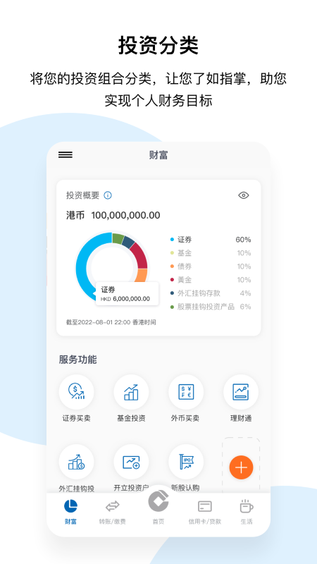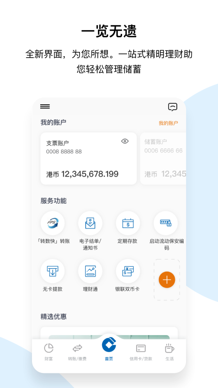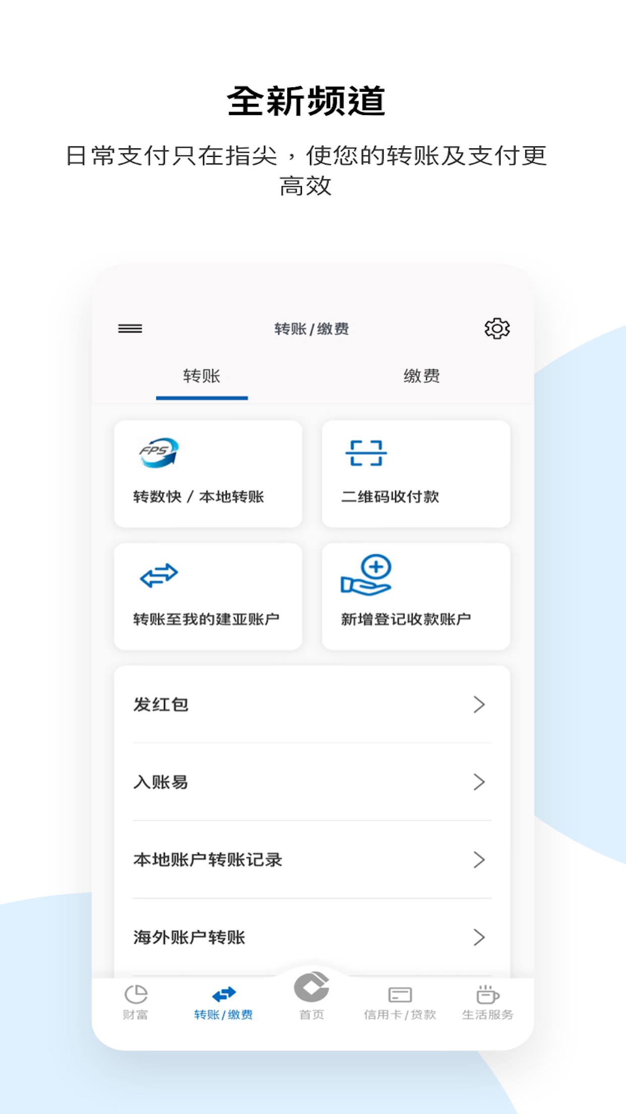 - 底部菜单的五大频道(包括主页﹑转账及缴费﹑信用卡及贷款﹑财富﹑生活页面) 主要功能全部重新配置,更切合用家日常使用需要
