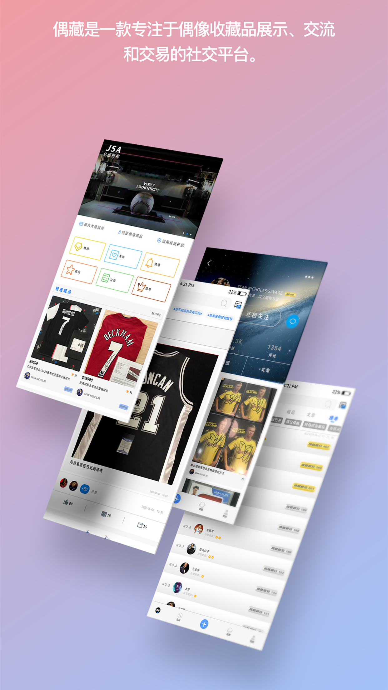 偶藏是一个聚焦于偶像收藏品展示、交流与交易的社交平台,其藏品类别包含体育、娱乐、动漫、电竞以及历史文化名人这五大类型。在偶藏这个平台上,您能够享受到如下体验:
