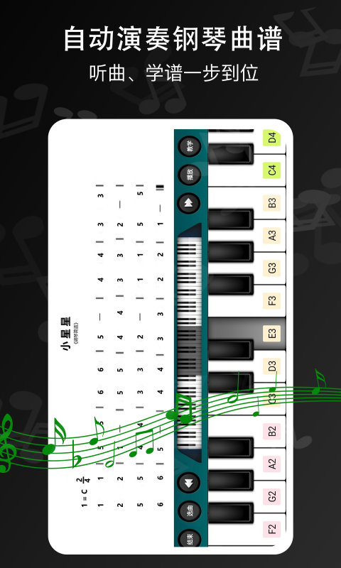 钢琴陪练:可自动演奏钢琴谱,让您听曲、学谱、弹琴同步进行。