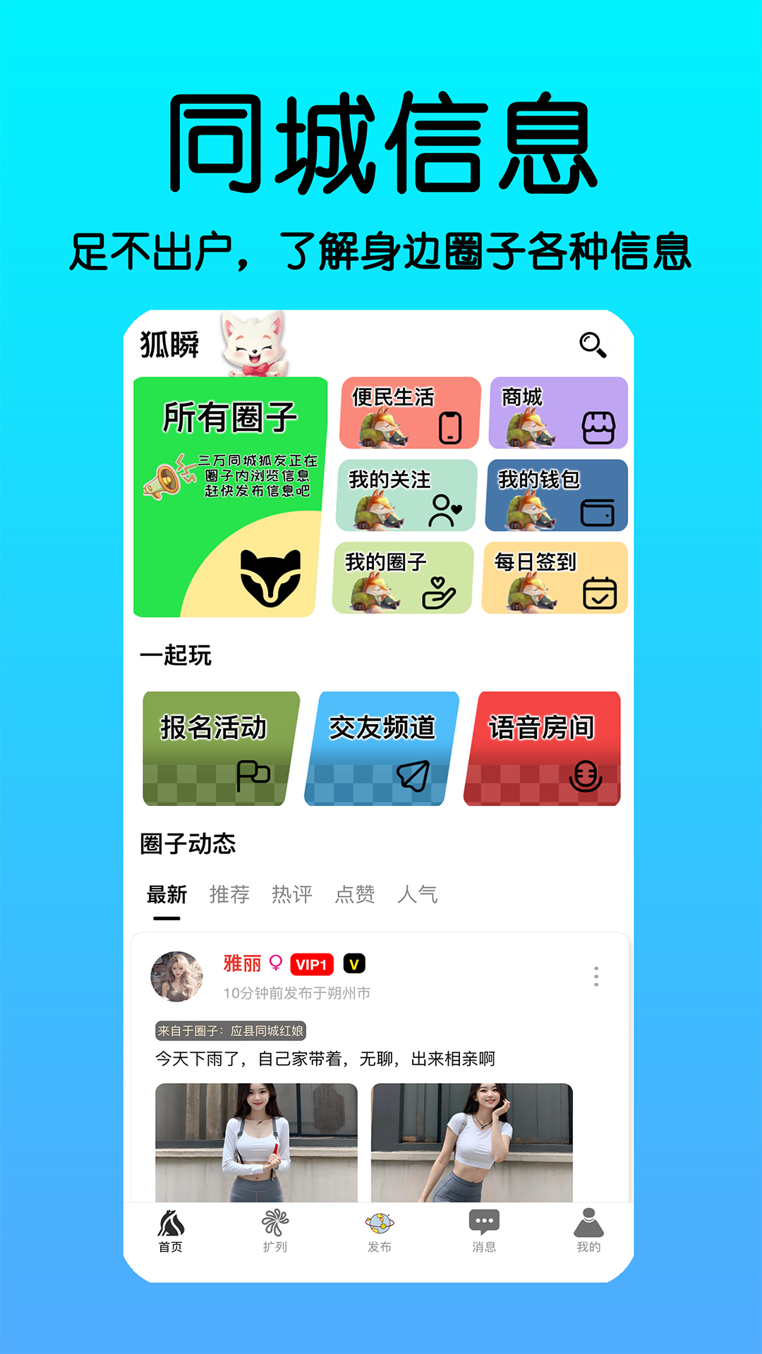 本app致力于打造一款信息化平台,能够提供给用户更加迅捷的当地信息,并且还为年轻客户提供了社交平台,该社交平台包括但不限于游戏开黑,相亲,招聘等最新消息信息。还为商家们提供了能够以廉价的付出收获到可观回报的机会。