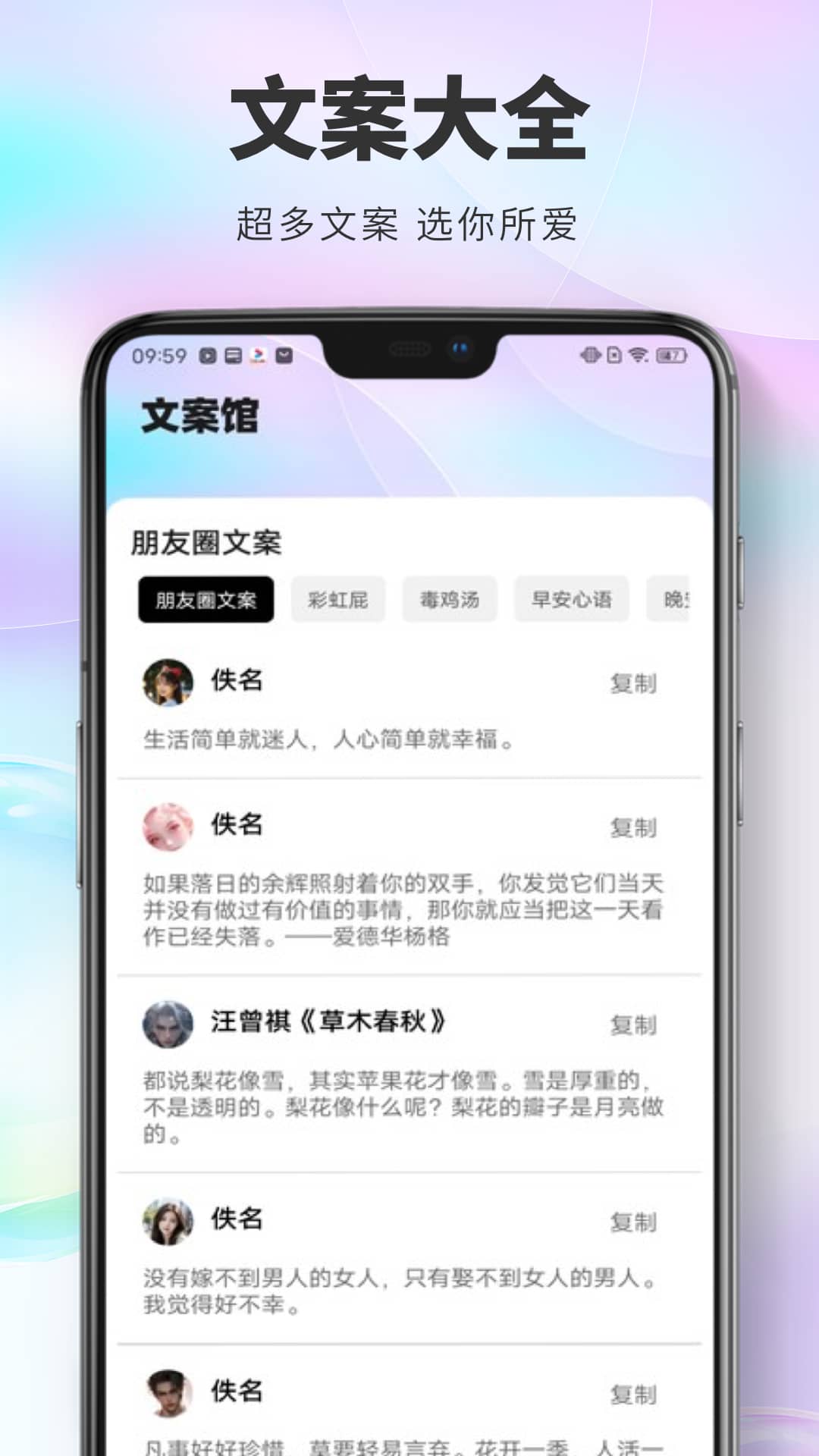 朋友圈文案:彩虹屁、毒鸡汤、早安心语、土味情话、经典台词、名人名言、舔狗日记等。
